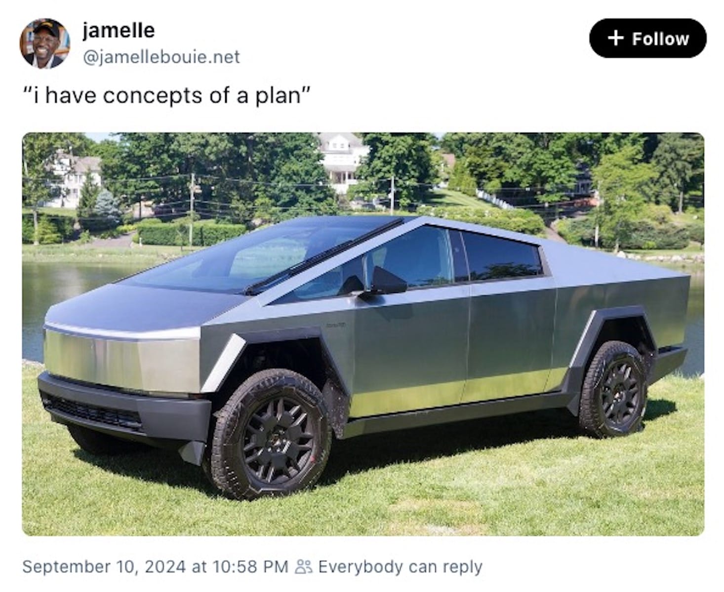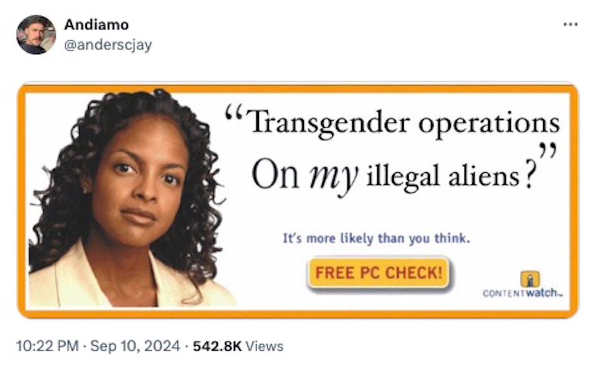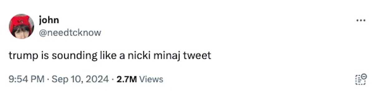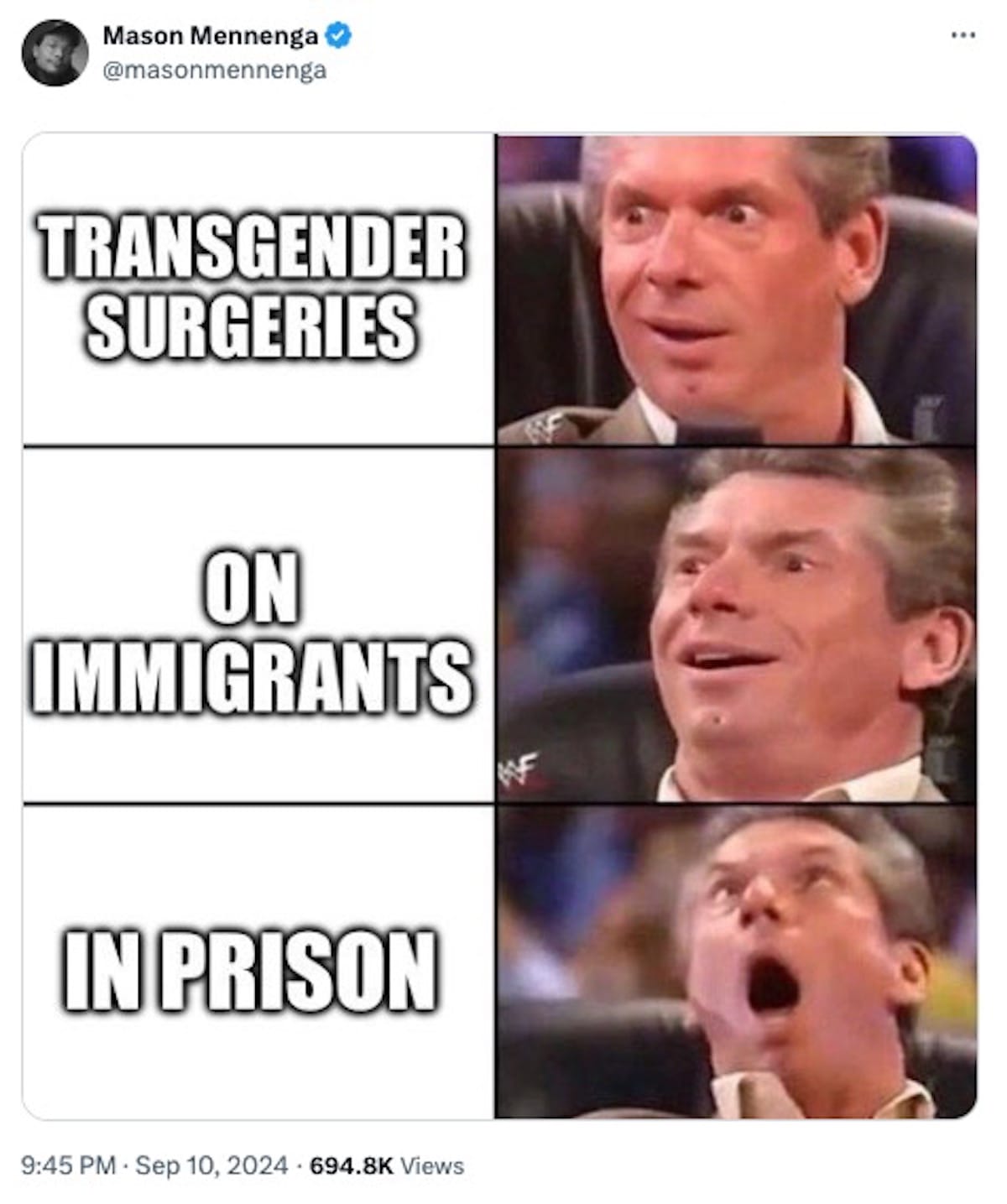 In a brand-new sentence in the history of the English language, Trump accused Harris of wanting "to do transgender operations on illegal aliens that are in prison." Harris looked both amused and flabbergasted at this, mirroring our collective expressions to the former president and convicted felon's Mad Libs-aligned conservative word salad that probably elicited the most rewinds in live television history.