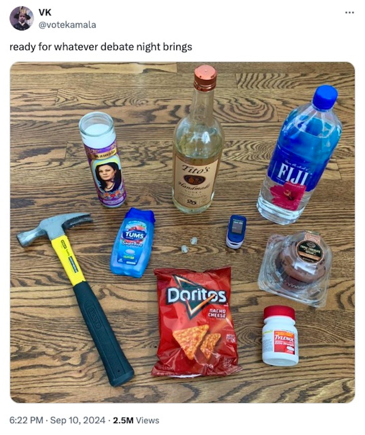It's important to remember to come prepared with the essentials in situations like this. The Kamala Harris prayer candle is a nice touch, as is the pulse oximeter. No comments on the hammer.