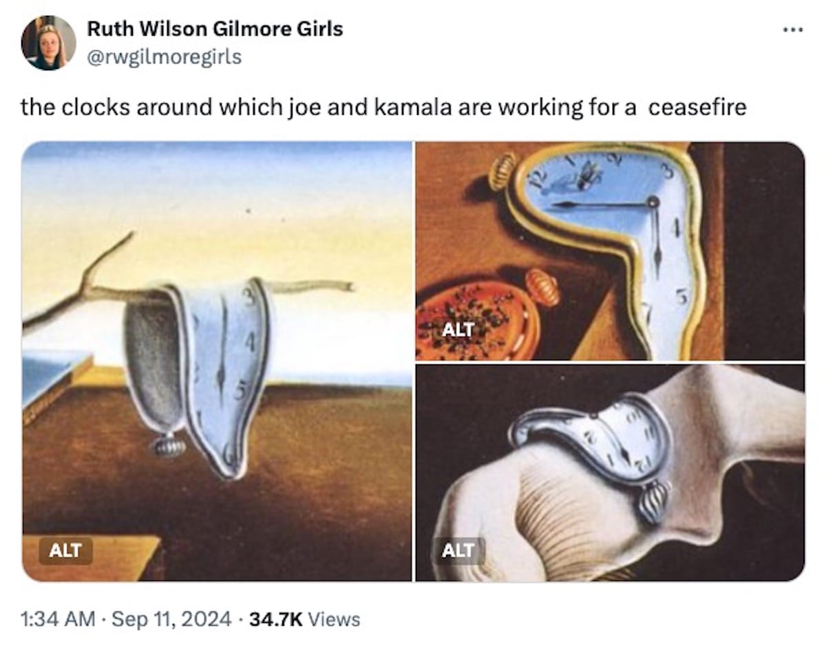 Alright, alright ... I should at least get some digs into Harris after all of this. After sounding like a broken record about her and Biden "working around the clock" to secure a ceasefire and hostage return deal in Gaza, it's become clear that this must be the metric of time she's referring to ...