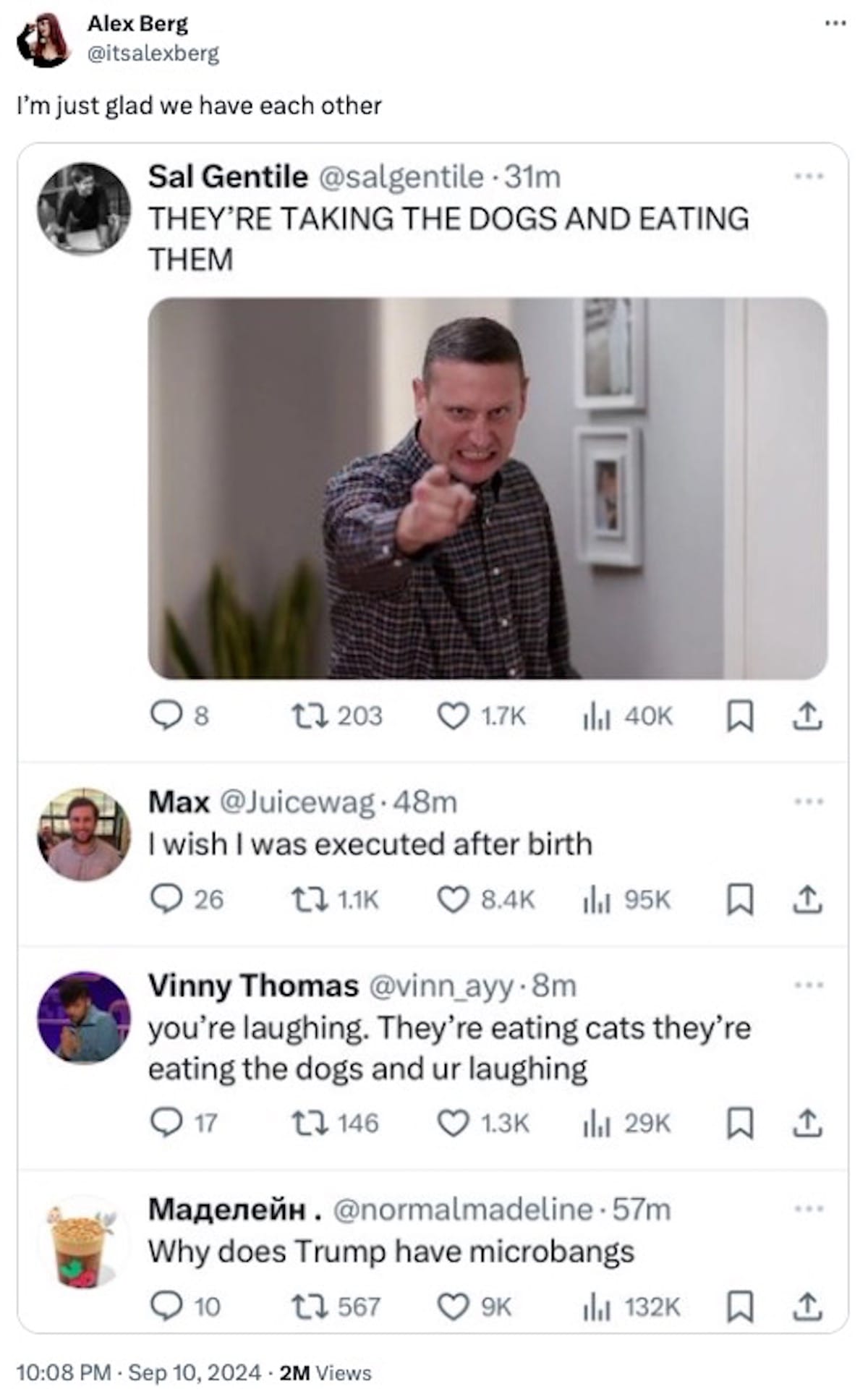 Another element of the debate that took the internet by storm was when Trump kept peddling that in the town of Springfield, Ohio, Haitian immigrants were eating local residents' dogs and cats, a racist claim that has been rigorously debunked. Debate moderator David Muir fact-checked him immediately, saying that Springfield's city manager shared that there were no credible reports validating such allegations despite what Trump said he "saw on TV."