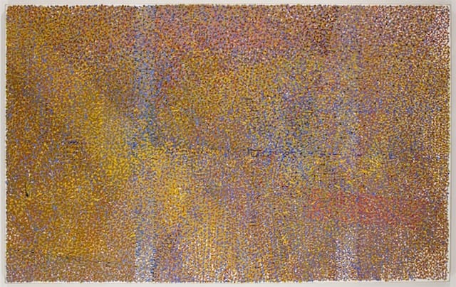 Several works from the 2007 exhibition are reprised here, including “MARCH” and “April” and the imposing “HEAVY HEMLOCKS I” (1999) and “HEAVY HEMLOCKS II” (2000), Both are 40 x 60 inches, and are made up of dark, mossy umbers, blacks, greens and blues, with veils of yellow, orange and bright green invading from the right and left sides. Of all the works in the show, these two are the most beguiling in the way their surfaces change as you move from left to right, with the dots of black falling back and the brown seeming to press into the picture plane.