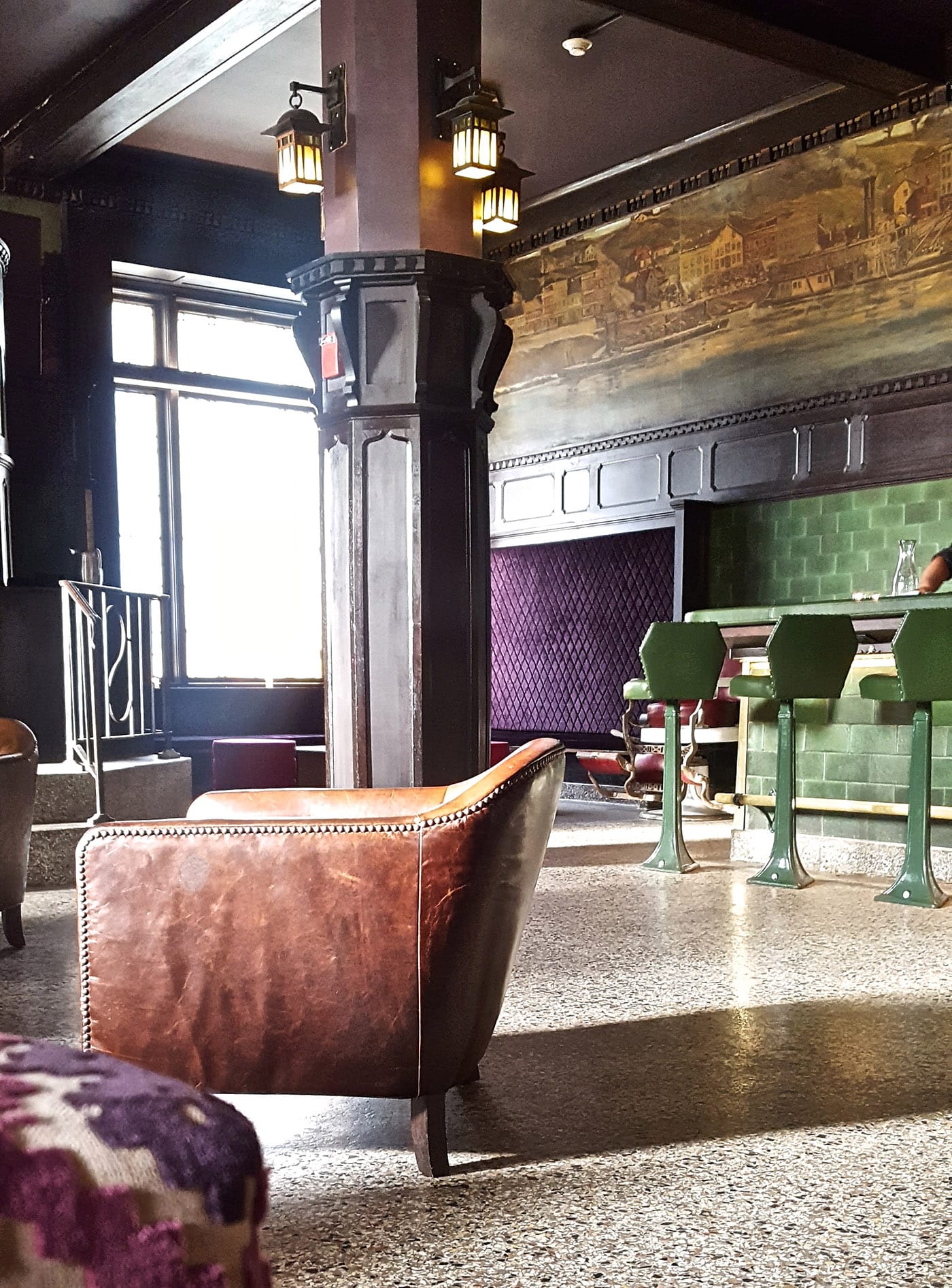 Wilson refers to what was once the Savoy Grill — a Kansas City fine dining restaurant, part of the Savoy Hotel, built in 1903. Over a century of operations, the restaurant’s dining room retained its original elements, including opulent woodwork, art deco stained glass windows, and, most contentiously, the Savoy Murals, painted by artist Edward Holslag in 1903. Wrapping around the entire upper register of the former dining room, the murals depict a cowboy-heroic mythology of pioneers on their journey along the Santa Fe Trail. The Savoy Grill was shut down after a kitchen fire in 2014, and as the 21c earmarked it for a new location, they had to contend with both the protections of the National Register of Historic Places, and the sentimental attachment of longtime locals to this legacy establishment.