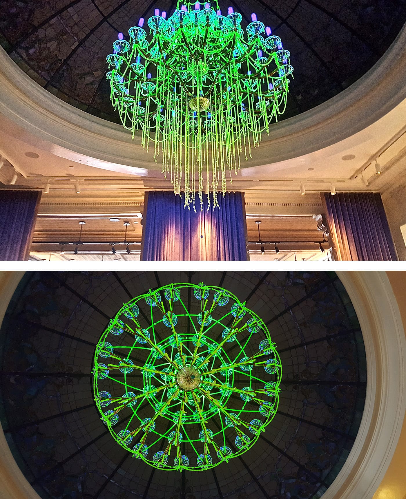 Kahlhamer’s installation is just one of several permanent sited works at the 21c. There’s also “Linear Sky” (2018), by the collaborative duo Luftwerk, a series of light fixtures that convert the hotel’s tunnel-like entryway into an optical illusion, flooding it with colorful patterns that reflect the real-time chromatic spectrum in the sky above. In the domed lobby hangs a chandelier made of uranium glass, which glows a sinister, irradiated green under its blacklight bulbs. Called “Crystal Palace: The Great Exhibition of the Works of Industry of all Nuclear Nations (U.S.A.)” (2015), the work is part of artist duo Ken + Julia Yonetani’s series of 31 uranium glass chandelier sculptures; each chandelier’s size corresponds to the scale of a specific country’s nuclear power capacity. The 21c has acquired the largest piece in the series — “U.S.A.,” of course.