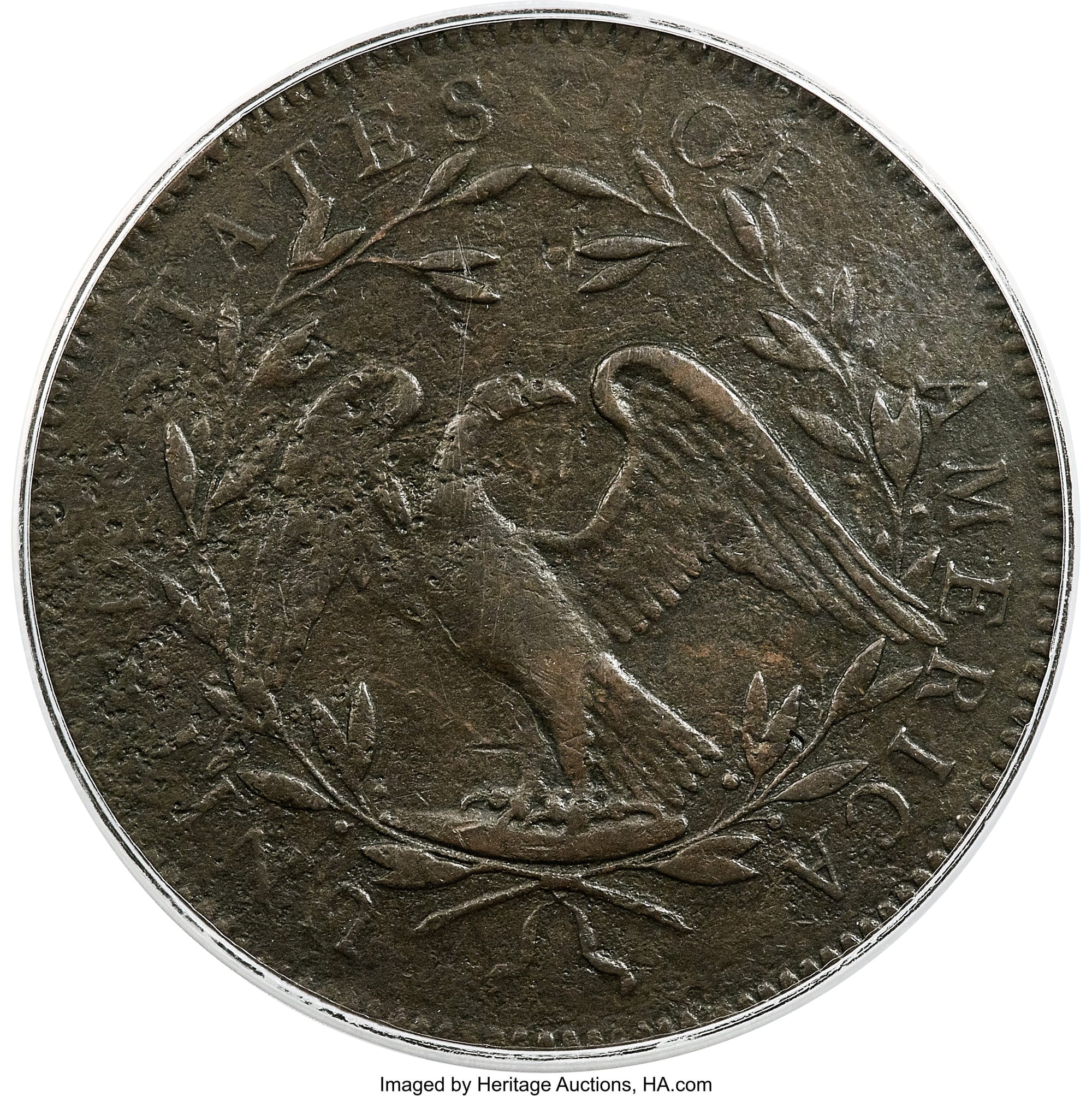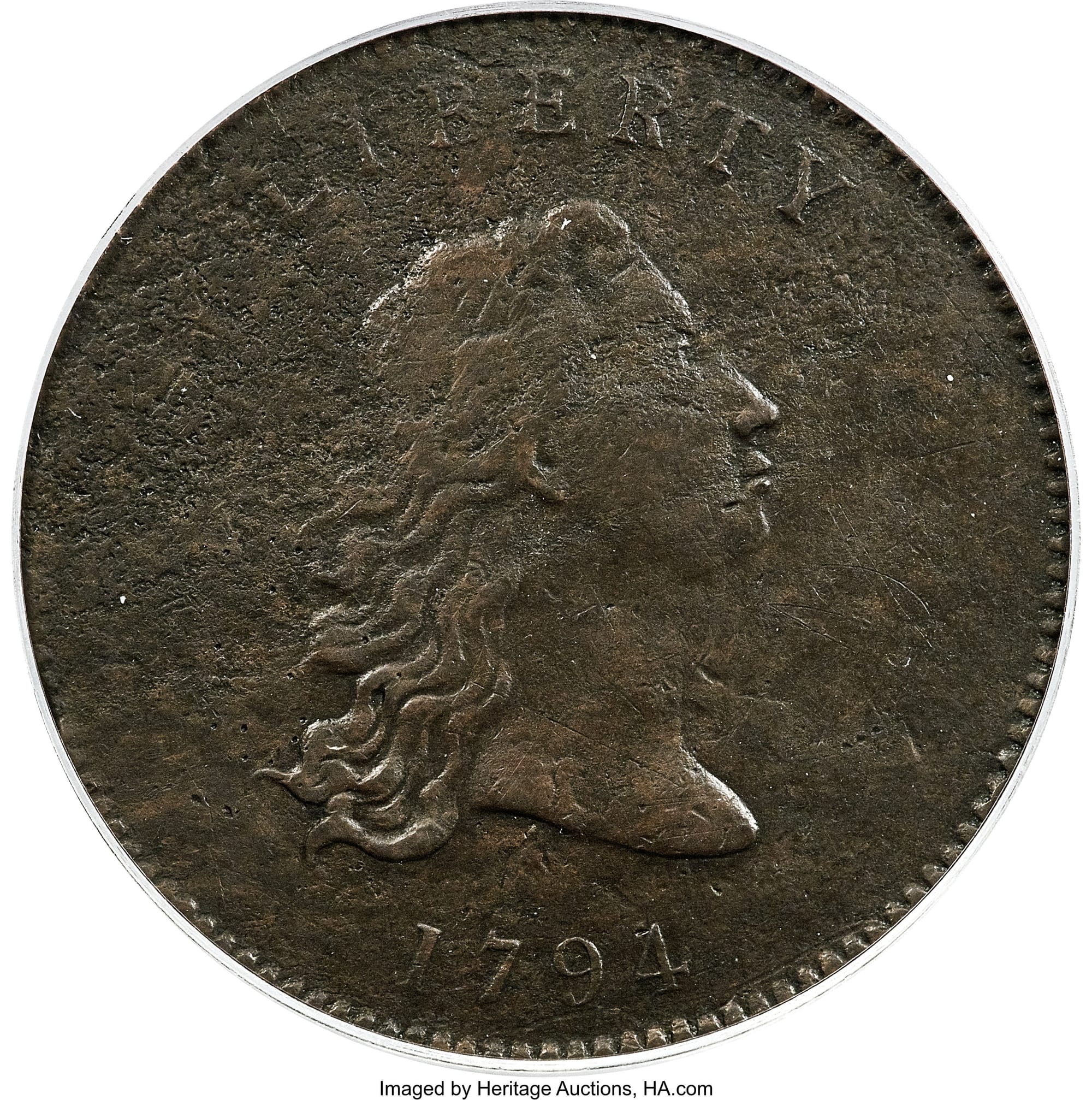 Among other design specifications laid out by Congress, each coin was required to have “an impression emblematic of liberty” on one side and “the figure or representation of an eagle” on the other. While the final design issued in 1794 featured Lady Liberty encircled by decorative stars, the earlier “No Stars Flowing Hair” dollar depicts Liberty, her locks flowing, on a barer coin without stars. As the Mint Act did not stipulate that stars were to be a design element, coin expert Michael Hodder wrote in the August 1989 issue of The Numismatist, it may be starless copper rarities like this one that “represent a literal interpretation of the wording of the Mint Act of 1792” and are “the only survivors from 1794 that show the originally intended appearance of our very earliest silver coinage.”