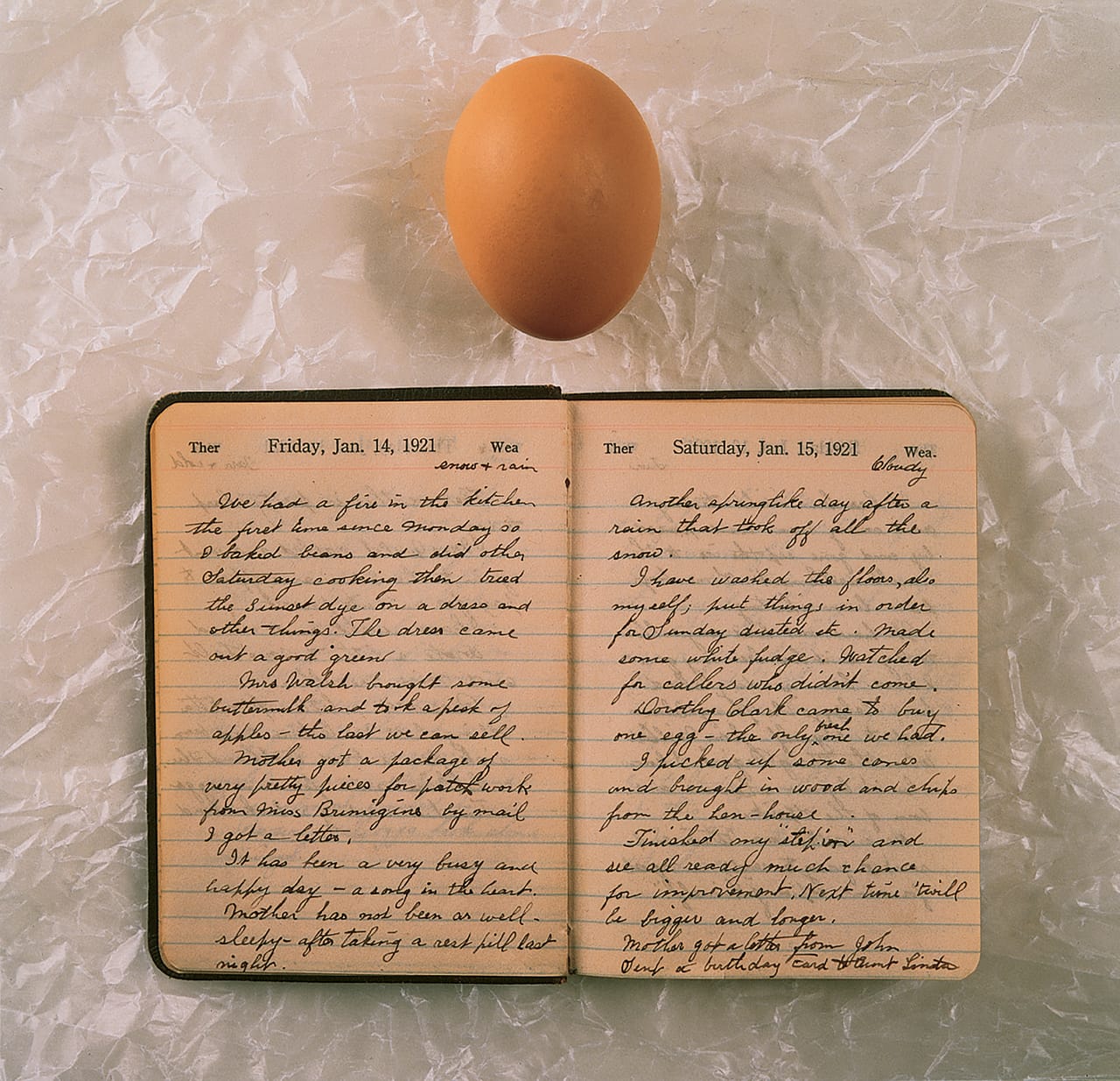 In her series, Domestic Objects, Marasco photographs of pages from 19th century women’s diaries. In another series she photographs photographs of vacationing gay couples from early in the 20th century. In both groups she incorporated objects, as diverse as an egg to popcorn into the setup. By surrounding the photos or diaries with incongruous items, which she then photographs, Marasco turns them into homages that recall the work of Joseph Cornell.