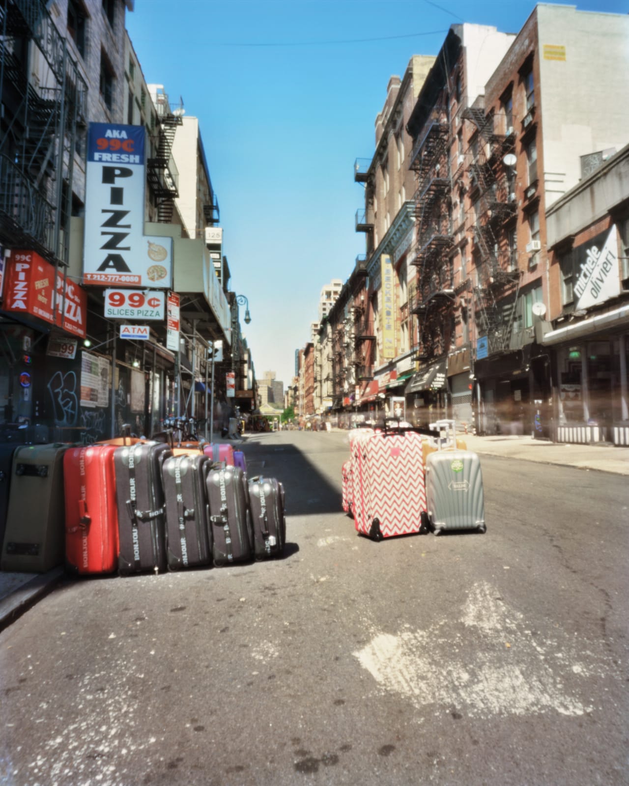 In “Orchard Street near Delancey Street, May 13, 2013,” Marasco used a pinhole camera situated near the street to photograph a row of red and gray suitcases, back to front, extending from the sidewalk, which is in shadow, to the bright, deserted street. A cluster of other traveling cases sit in the middle of street. There is something uncanny about the image, a sense of desolation and the feeling of being thwarted. Of course, one can explain why the suitcases are there, but that is not the point. Marasco might point the camera at something, but she is not being literal or theatrical. Something else has caught her attention, and that I think is one of her strengths. She is able to make a memorable image out of commonplace things. The street toward buildings in the distance, suggesting that there is nowhere to go, that one is bounded by one’s circumstances, whatever they are. The desire to travel, to be elsewhere, comes across as a forlorn wish.