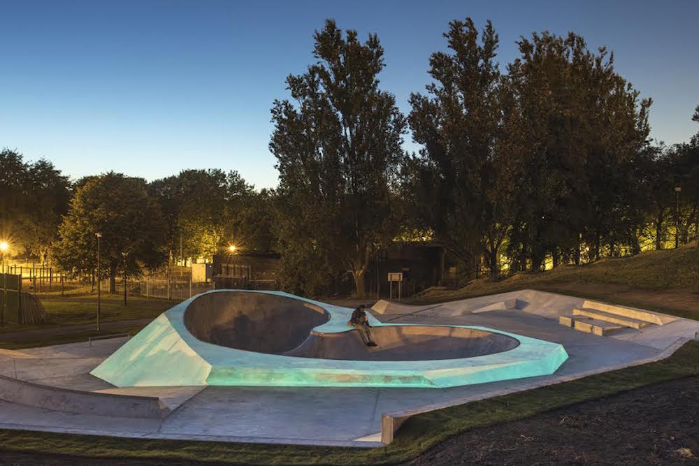 A glow-in-the-dark skate park designed by artist Koo Jeong A opened in Liverpool.