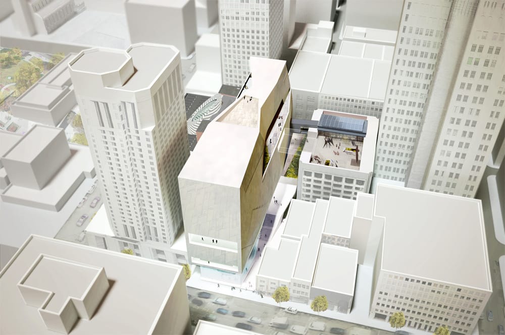 Christopher Hawthorne of the LA Times writes that the new design has a “flinty personality,” perhaps most visible in the building’s rock-like textured skin shown off in the renderings (seen above). Still, the critic cautions, these designs are by no means finalized.