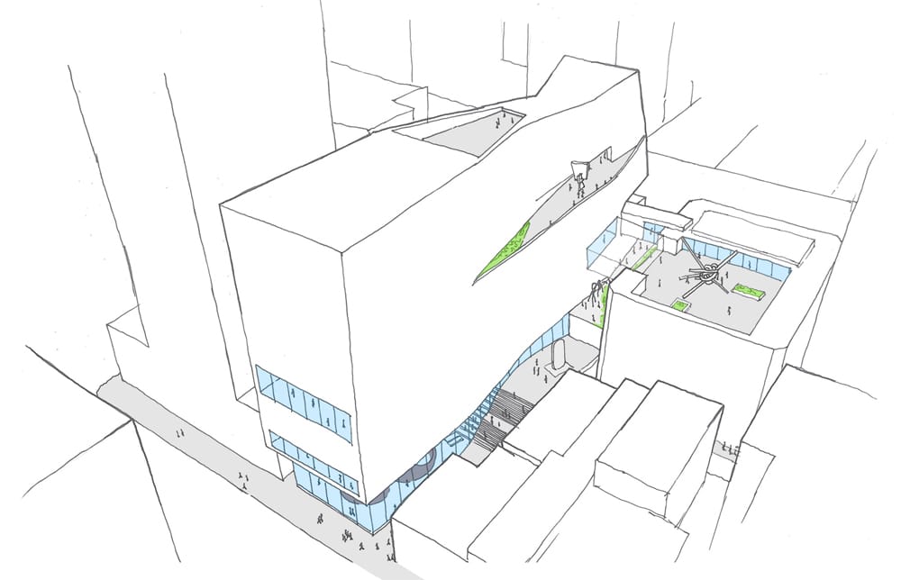 Despite its imposing presence, the building’s footprint also leaves room for a human presence: “The new building does not push tightly against its property lines; instead it creates new public spaces and pedestrian routes through the neighborhood along with open views of the surrounding streetscape,” writes Snøhetta architect Craig Dykers in a press release.