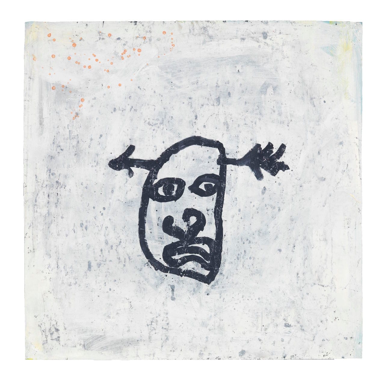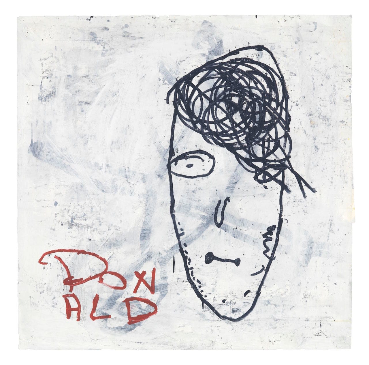 The abject characters begat from Baechler’s art-brutish lines populate a postmodern absurdist comedy into which the artist seems to have relegated himself, having written his name in large, red script across the surface of a few paintings, including one explicitly titled “Self Portrait” (1984). This disembodied, potato-shaped head, with a single, scribbled oval for an eye, a set of squiggles for hair, a shriveled, limp slip of a nose, and an incongruous trace of a smile, is laid over what appears to be a whited-out figure falling from the sky, an Icarus or Phaethon brushing too closely to the sun.
