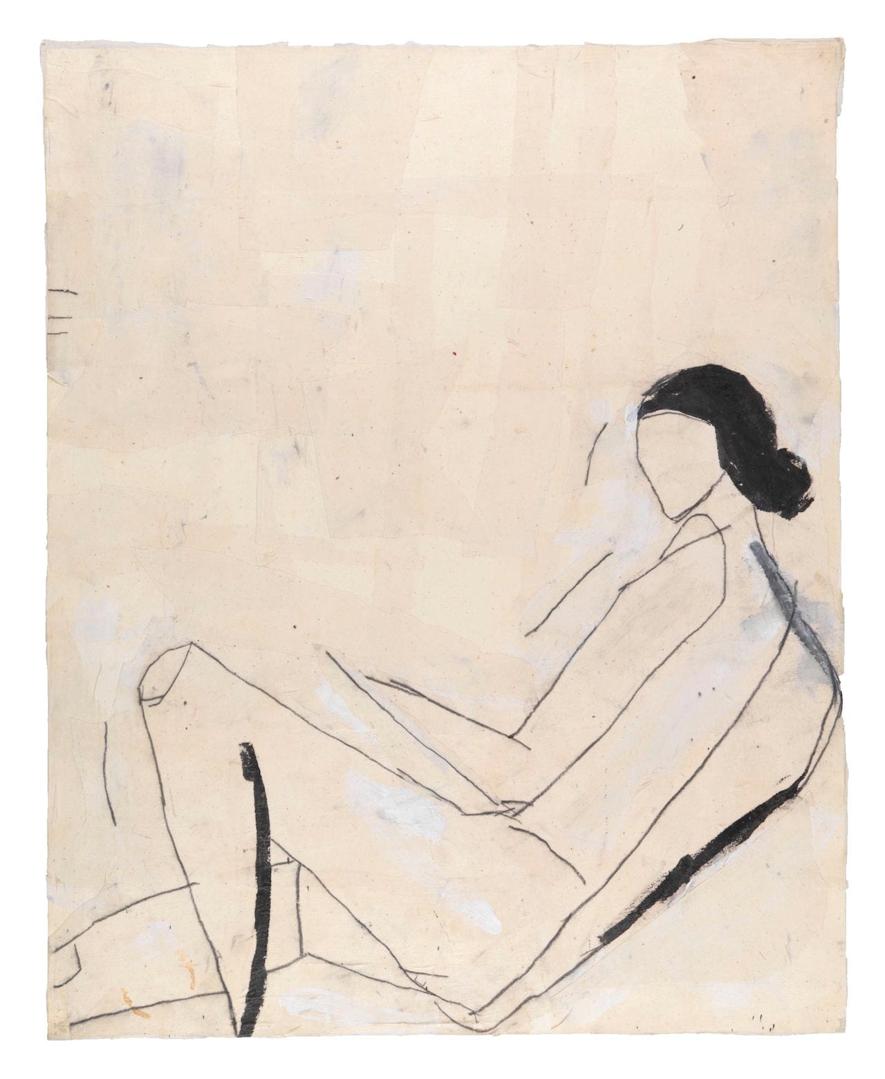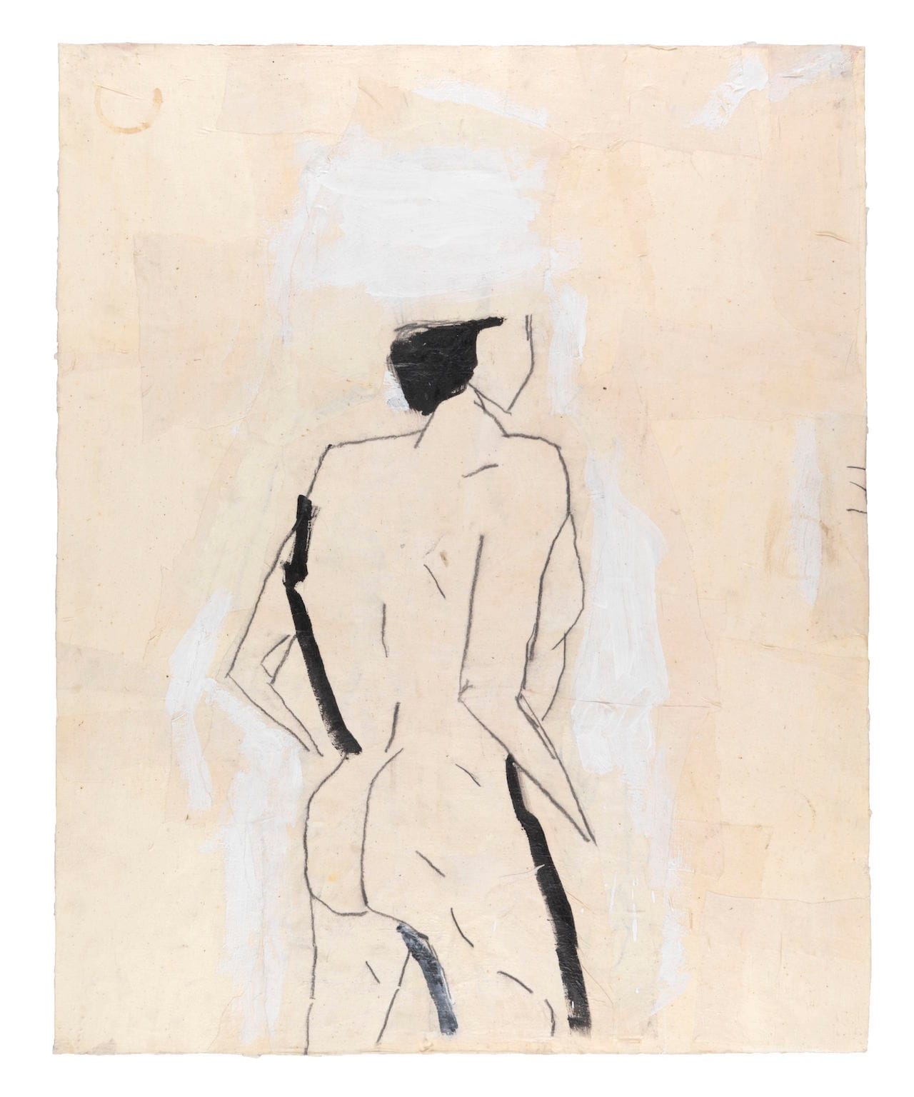The shapes are raw, awkward and deliberately artless. In “Standing Nude (after Shelby Creagh),” the model’s head is truncated by a brushy cloud of white paint that activates an otherwise empty expanse above the figure. The woman depicted in “Reclining Nude (after Shelby Creagh)” is squashed into the lower right-hand corner, with a full third of the sheet unoccupied save for three curious, short horizontal dashes on the far left.