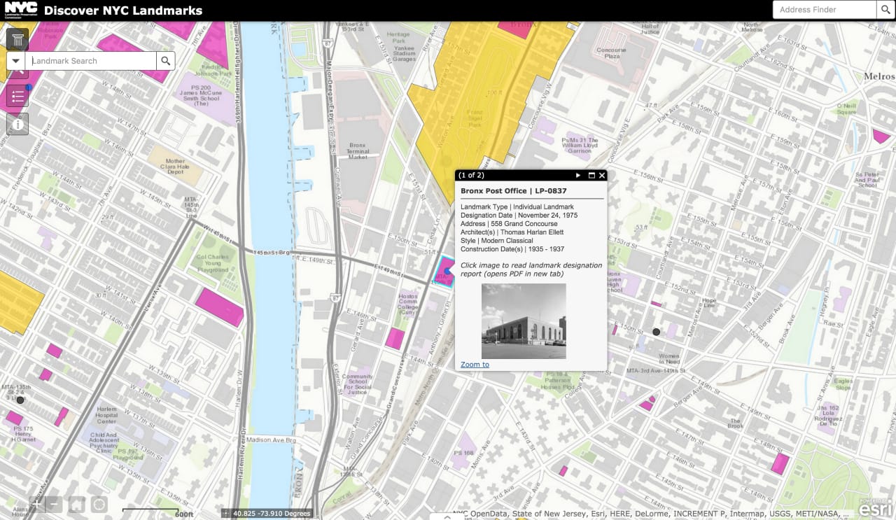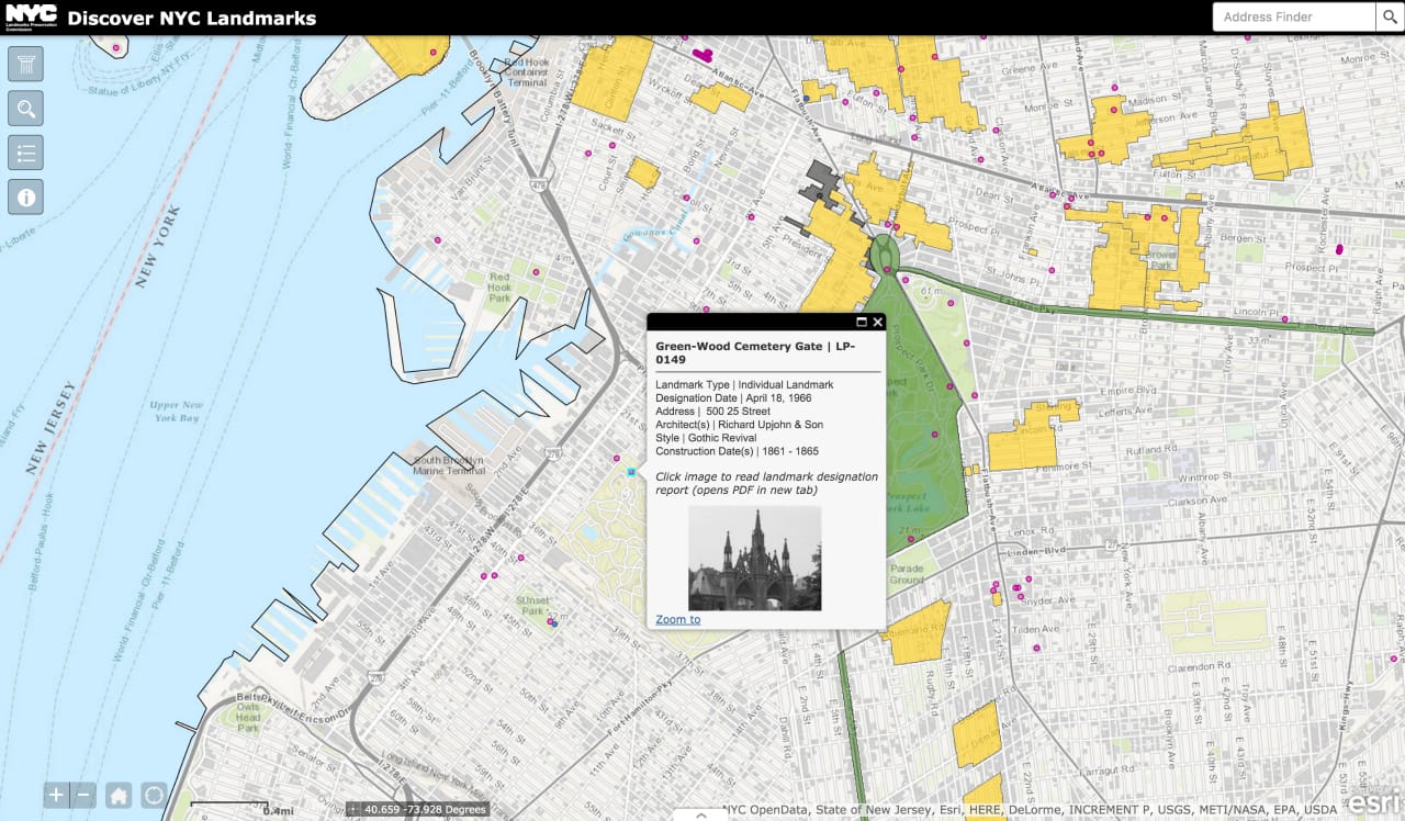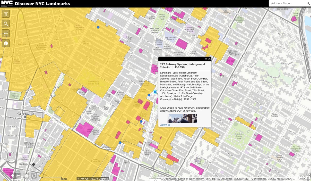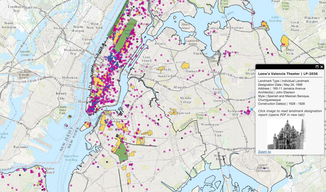 It’s a basic design, powered by ArcGIS, pinning the individual, interior, and scenic landmarks with dots, and shading in the historic districts. Each accesses brief information on the landmark, with an image to click to a PDF of its designation report.