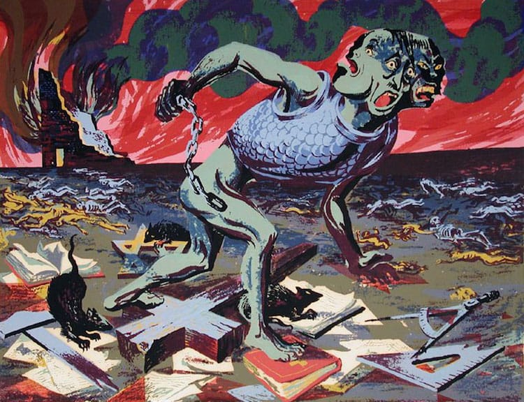 Similarly political, “Fascism” (1943) features a three-headed ogre – each face representing one of the three Axis powers — stomping through a hellscape strewn with rotting corpses, rats, assorted religious tomes, and scientific paraphernalia. If nothing else, this propagandistic image reminds viewers that the murderous violence unleashed by fascism is first subsidized by religious and ethnic absolutism and then advanced by counterfeit promises of progress.