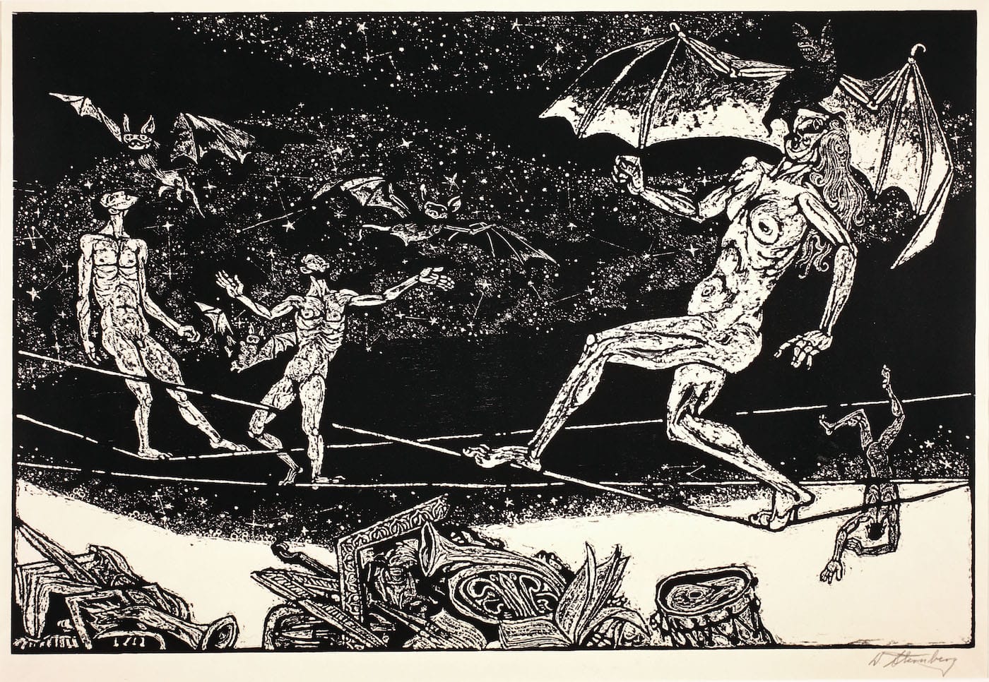 “Creators and Critics” (1985-86), a large black-and-white power tool woodcut revives a favorite Sternberg motif in which he represents the artist in the guise of a carnival performer. Walking on overlapping high wires set beneath a night sky ignited by bright constellations, four semi-abstract acrobats are stalked by gruesome bats fluttering over their heads. One acrobat tumbles off the wire. Below lies a heap of broken picture frames, neglected books, and discarded musical instruments, representing the lives of artists who, like Sternberg, struggled with the cultural high-wire act.