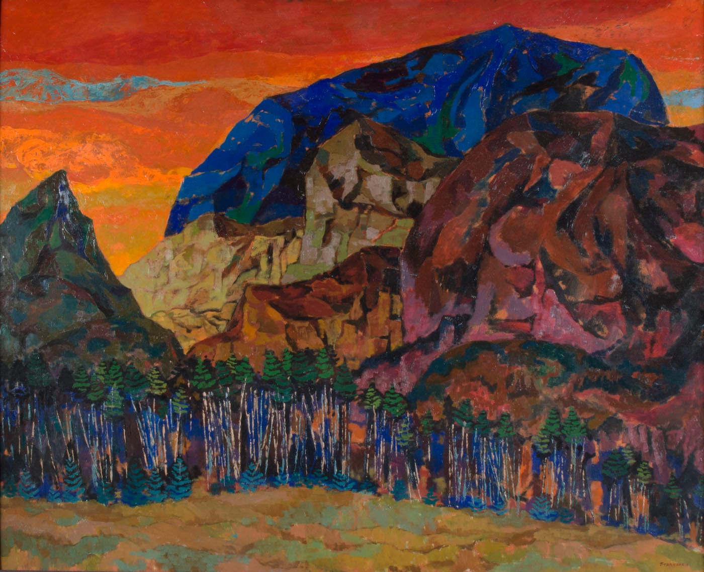 “Mountains and Birches of Utah” (ca. 1957) situates mountains of cobalt blue, greenish brown, and yellow-and-green under a fiery orange sky. The mountains’ craggy bases are fenced in by a long parade of leafless birch trees mingled with small blue spruces. Spaciousness and heft combine with electrifying coloration to turn the landscape simultaneously majestic and forbidding.