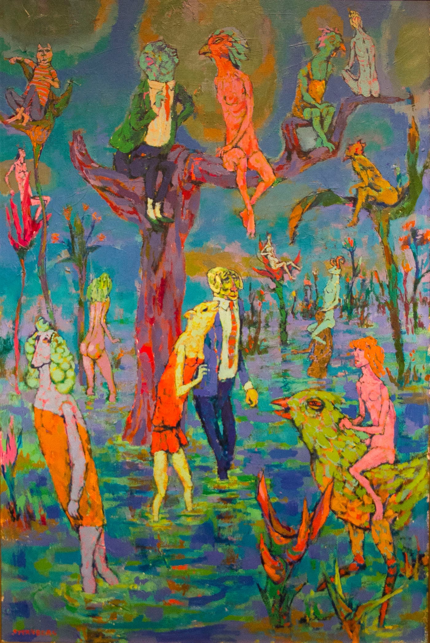 Or is it an ordinary California suburb reborn as a mythic, jewel-colored marshland? Some figures are perched on abstractly colored trees or gigantic flowers while others recede into the iridescent distance.