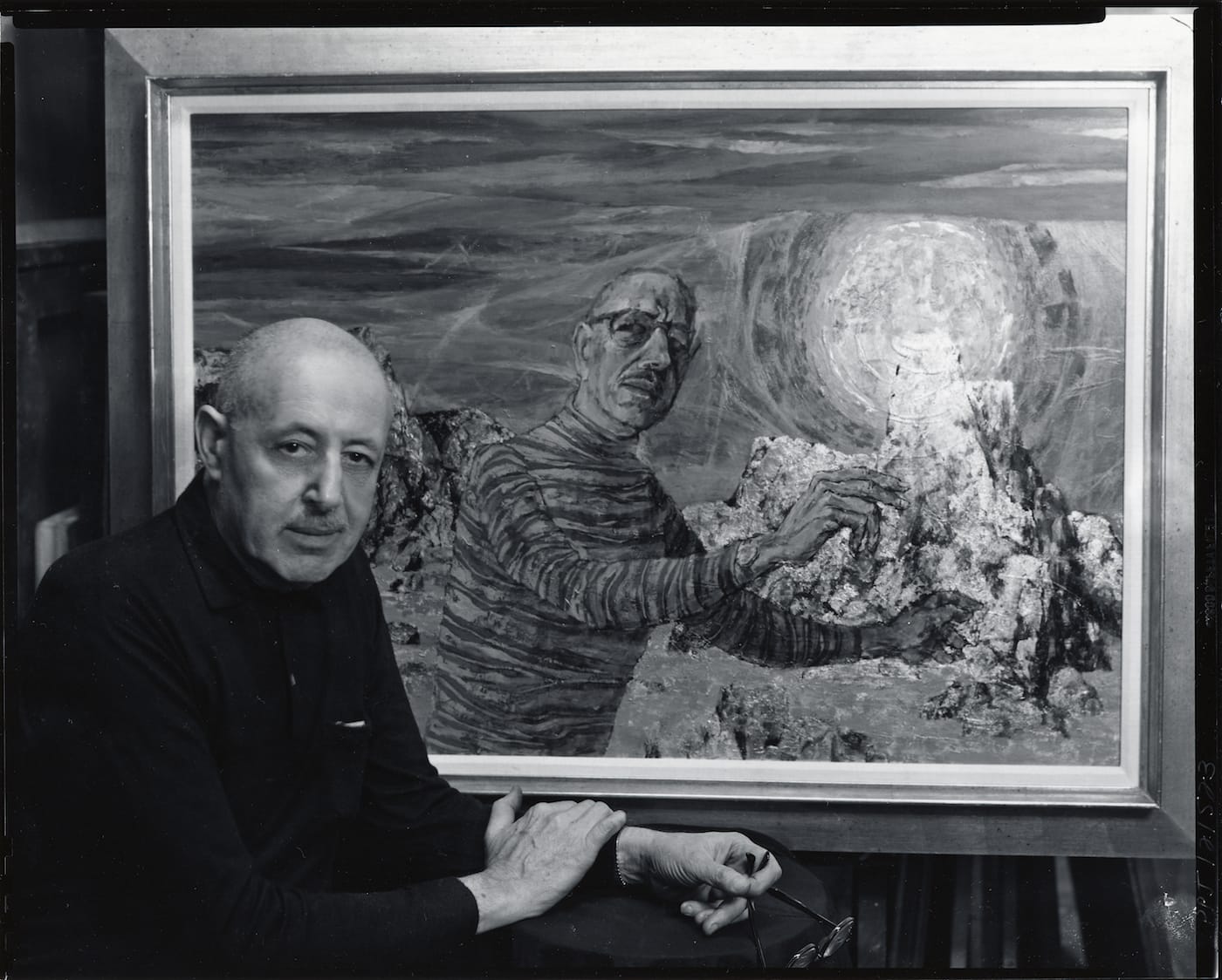 “Insecurity #1 Love” (1943-46) is even more elusive as an erotic allegory. In it, borrowings from Dali are overt. A bald, thin, androgynous nude leans against a headless female torso, adorning her with a string of pearls. Both figures loom above an abstract, depopulated landscape riddled with random doorways and windowed walls that lead nowhere.