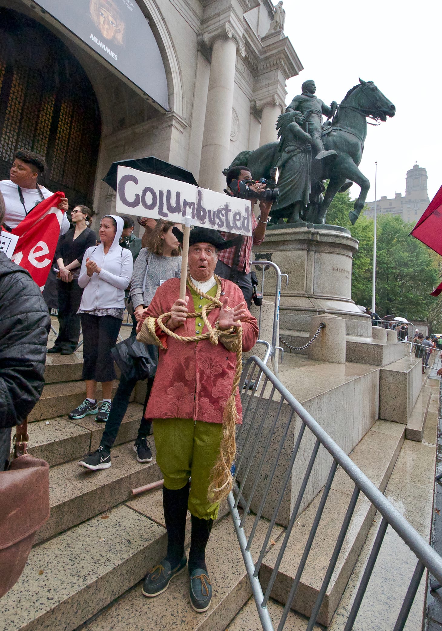 And learn we all did. The tour included not only the voicing of suppressed histories, but also traditional music and even a ritual tobacco offering. At the end of the tour, people filed out of the museum, chanting “Decolonize this Museum” and gathering outside, in front of the much-hated Roosevelt statue, with organizers unfurling an enormous “Decolonize This City” banner. Meanwhile a man dressed as Columbus stumbled, ludicrously cross-eyed, holding a sign that said “Columbusted.”