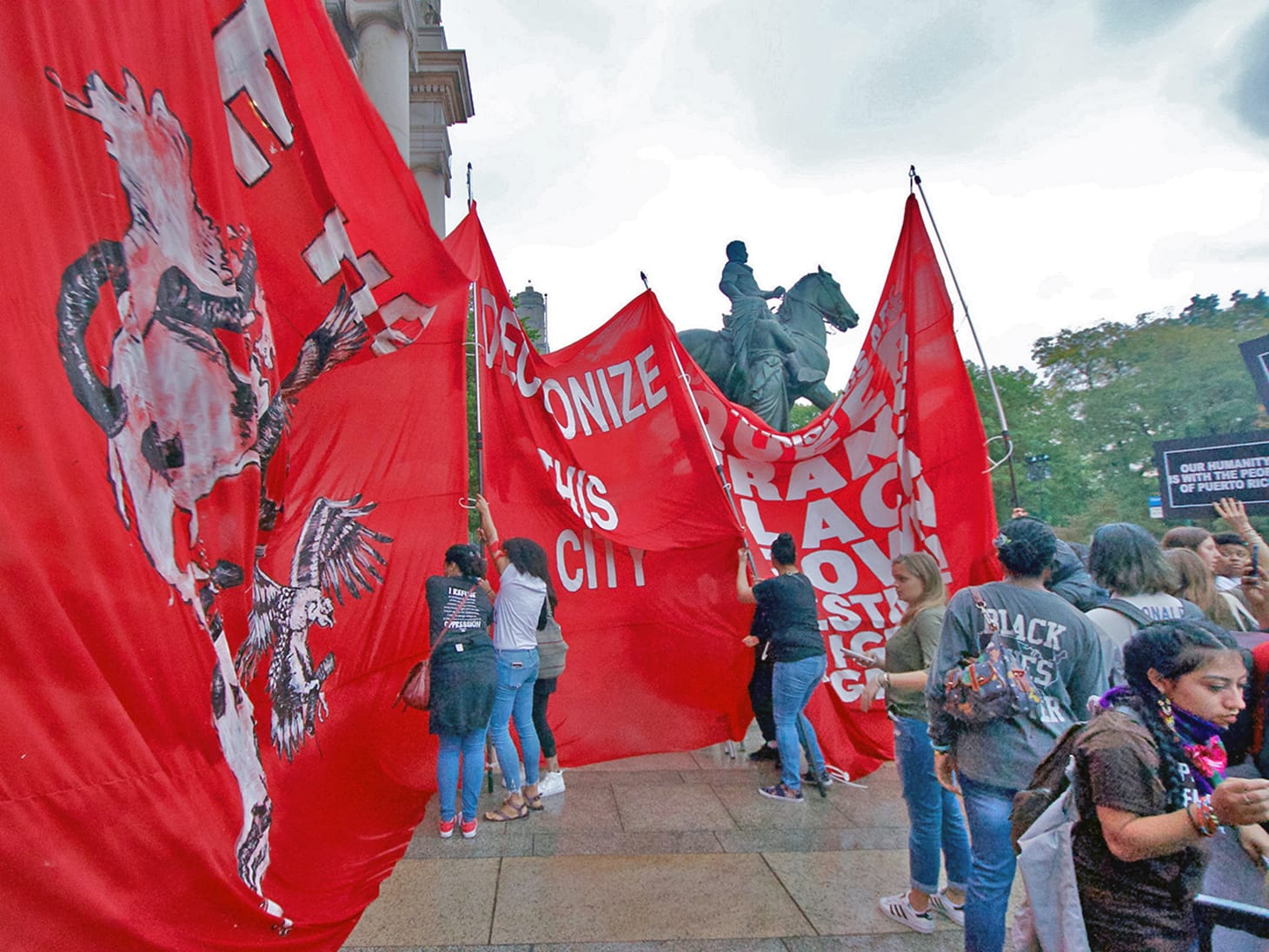 Outside protesters rallied as invited speakers addressed the colonization of Puerto Rico, the victims of police shootings, indigenous rights that continue to be ignored, and messages of solidarity in front of large colorful banners plastered with phrases like “Decolonize This City.”