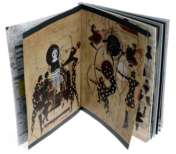 Because this catalogue lacks any kind of explanation, Behind the Curtain, as the title might suggest, is all the more playful and engaging, like the work itself. It’s clear that there are no “answers” to Dzama’s drawn narratives, no decipherable stories behind his photographs and yet we still engage with the work as we try to understand his mysterious characters and puzzling situations. Text enters into the catalogue in the form of comic book drawing strips and tiny, scribbled text in multiple languages layered behind the drawings. Because the text describes such complicated situations, and switches back and forth between French, Spanish and English, it feels as if it’s not meant to be read. Dzama’s catalogue seems to prove that sometimes monographs are helped, rather than hindered, by little to no explanation.