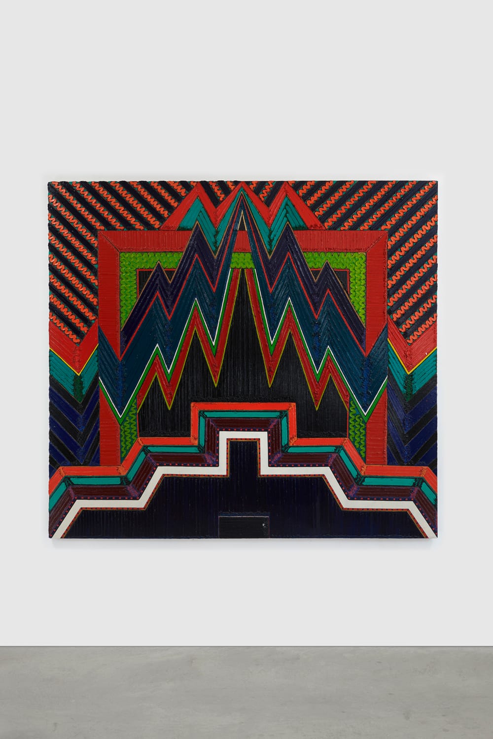 Mary Grigoriadis’s alluring works explore bodily spatial conditions and unseen expanding boundaries in their contrasting colors, symmetrical patterns, measured brushstrokes, and iconographic shapes. This exhibition, which spans the late 1960s through the mid-’90s, presents oil and acrylic paintings featuring colorful, geometric patterns juxtaposed against the stark white borders of raw linen. — Maya Pontone