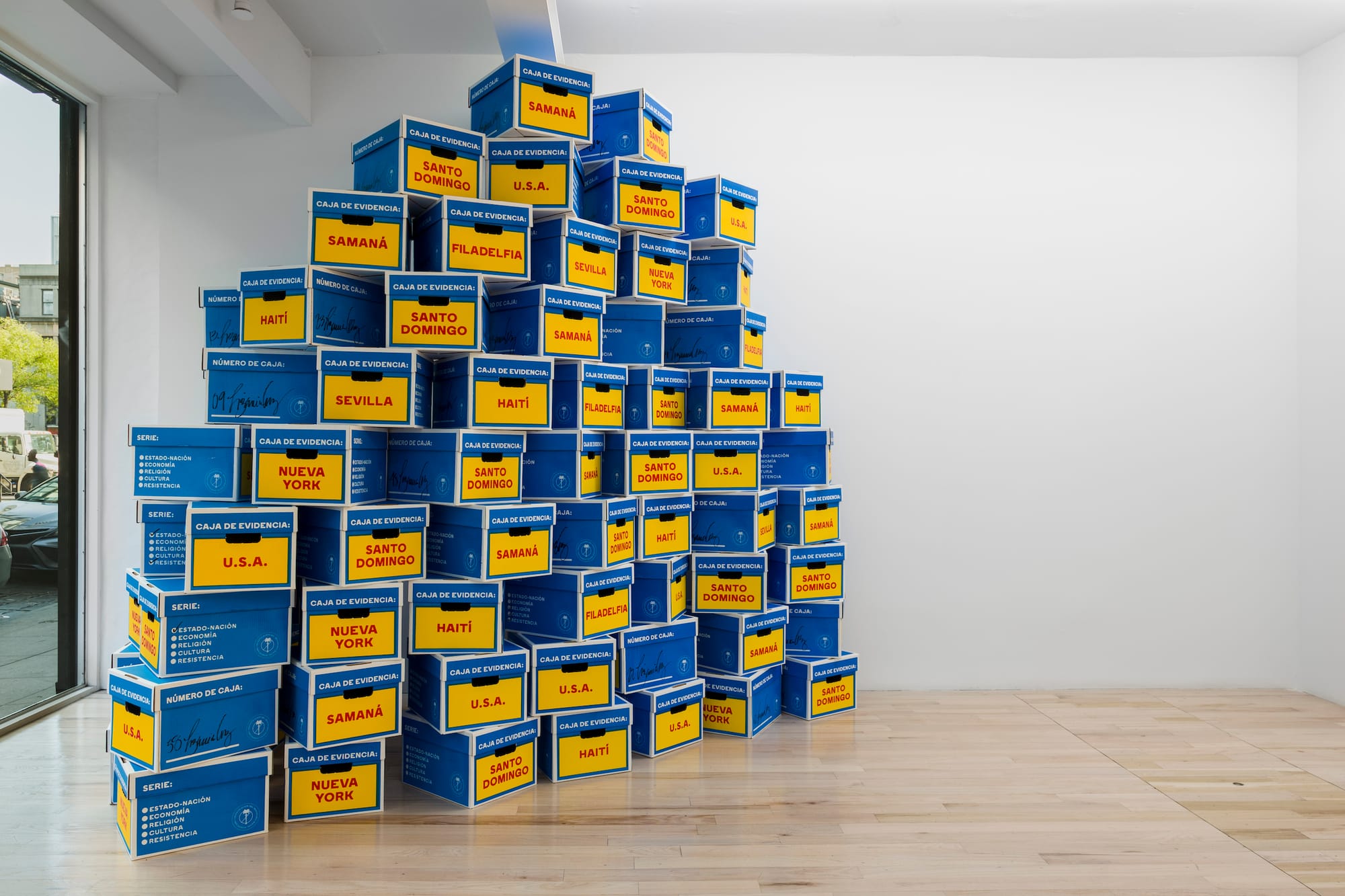 Entering Lizania Cruz’s exhibition feels a bit like trespassing on a crime scene investigation. A massive stack of cardboard boxes — each labeled with the Spanish word for “evidence” and the various geographic loci of Cruz’s project — leads us into a sterile gallery filled with film and photographic documentation, archival findings, and even a collage of images and clippings that resembles a classic evidence board. Many of these works chronicle the Dominican state’s pattern of suppressing Black and Brown activists who challenge authoritarian rule and United States imperialism. Outside, a yellow A-frame sign invites passersby to apply to be a “civilian reviewer” of Cruz’s research by finishing the statement on a banner hanging above the entrance; you’ll understand when you see it for yourself. — Valentina Di Liscia