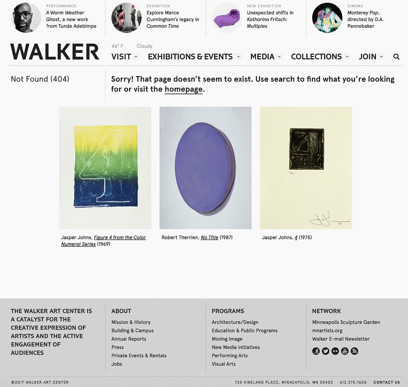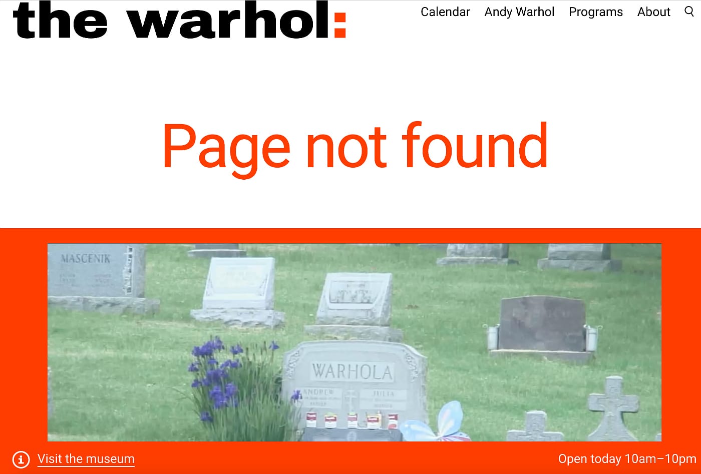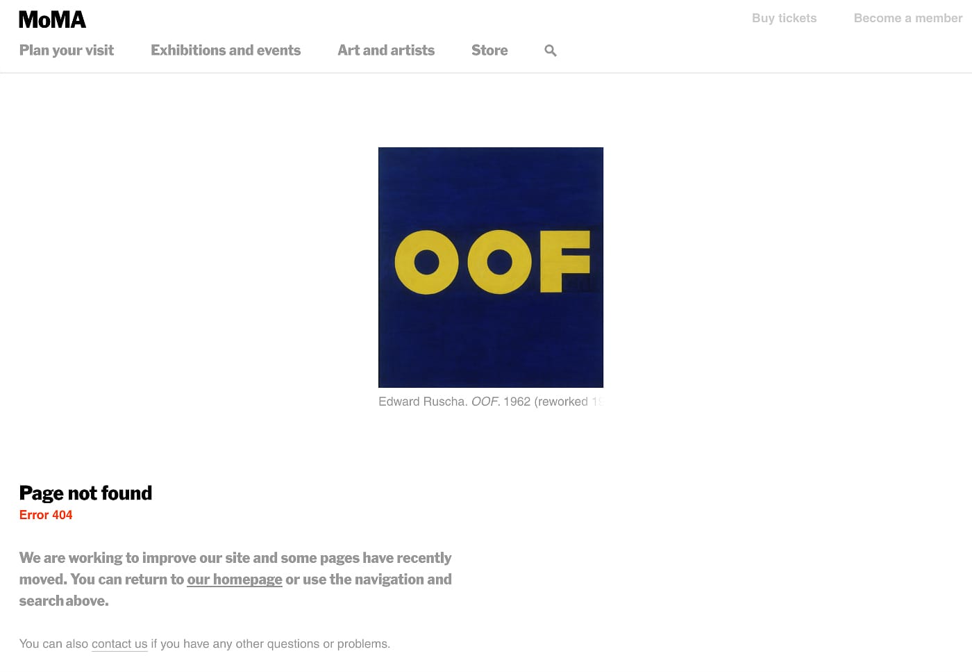 Solomon R. Guggenheim Museum, New York, with a 404 page that rotates dire images from the institution’s collections and exhibitions, including this one of Maurizio Cattelan’s “Daddy, Daddy” (2008)Smithsonian National Air and Space Museum, Washington, DC: “Houston, we’ve had a problem”Jewish Museum, New York: “Oy Vey!”Vasa Museum, StockholmMuseum of Modern Art, New York, with Ed Ruscha’s “OOF” (1962)Cooper Hewitt, Smithsonian Design Museum, New York, with a 404 page including a link to the Chester Jenkins typographyThe 404 page on the Cooper Hewitt collection siteVictoria & Albert Museum, London, with “Mirror” (1675)Museo del Prado, MadridSeattle Art Museum, with a video of a baby seal at the Olympic Sculpture ParkThe Andy Warhol Museum, Pittsburgh, with a 404 page that pulls up the livestream of Warhol’s graveWalker Art Center, Minneapolis, with work by Jasper Johns and Robert Therrien spelling out “404”Natural History Museum, London, with the institution’s “newest extinct resident”: a stegosaurus skeletonMuseum of Science and Industry, Chicago: “Whoops. There it isn’t,” with the 1902 Lambert typewriter that attempted to improve typingMount Vernon, Virginia, with George Washington’s faux “Rules of Civility”National Museum of Funeral History, Houston: “You have made a grave mistake!”Crystal Bridges Museum of American Art, Bentonville, Arkansas, with Joseph Decker’s “Boy Smoking” (1853–1924)Denver Museum of Nature and Science: “It’s not the end of the world…”Museo Nacional Centro de Arte Reina Sofía, Madrid, with one of the cycling 404 pages, this one showing the animation of Daniel G. Andújar’s “Technologies to the People” (2015)Exploratorium, San Francisco, with a link to instructions for building a camera obscuraCalifornia Science Center, Los Angeles: “Your theory about the location of this page has not withstood experimental analysis”Wellcome Collection, London, with an animation of Eadweard Muybridge’s running catThe Tech Museum of Innovation, San Jose, CaliforniaPerot Museum of Nature and Science, Dallas: “This experiment has gone wrong”Science World at Telus World of Science, VancouverRock and Roll Hall of Fame, Cleveland, with a 404 page whose “page not found” and “broken” texts are animated as breakingHenry Ford Museum of American Innovation, Dearborn, MichiganSalvador Dalí Museum, St. Petersburg, FloridaShchusev Museum of Architecture, Moscow