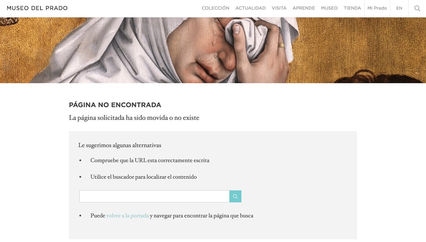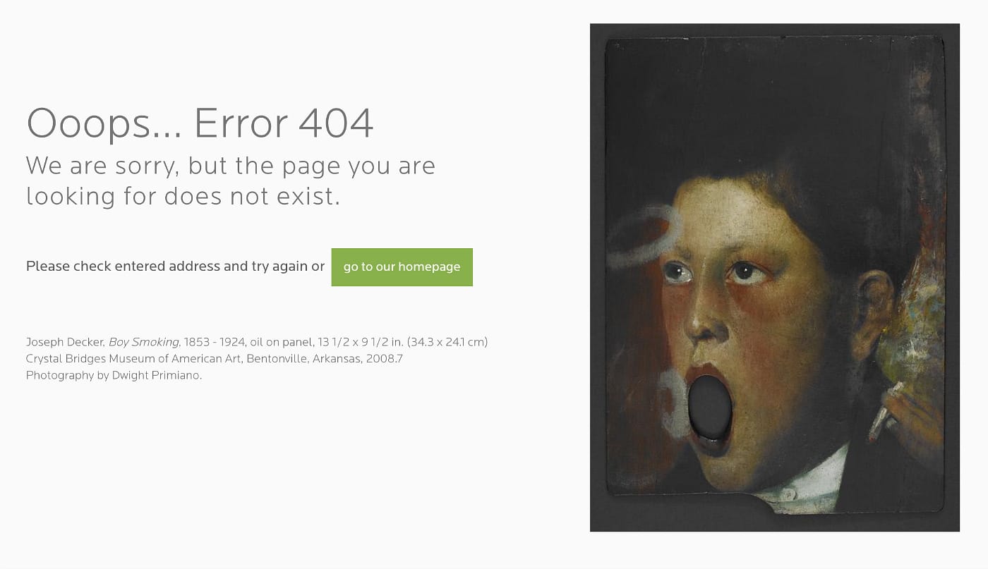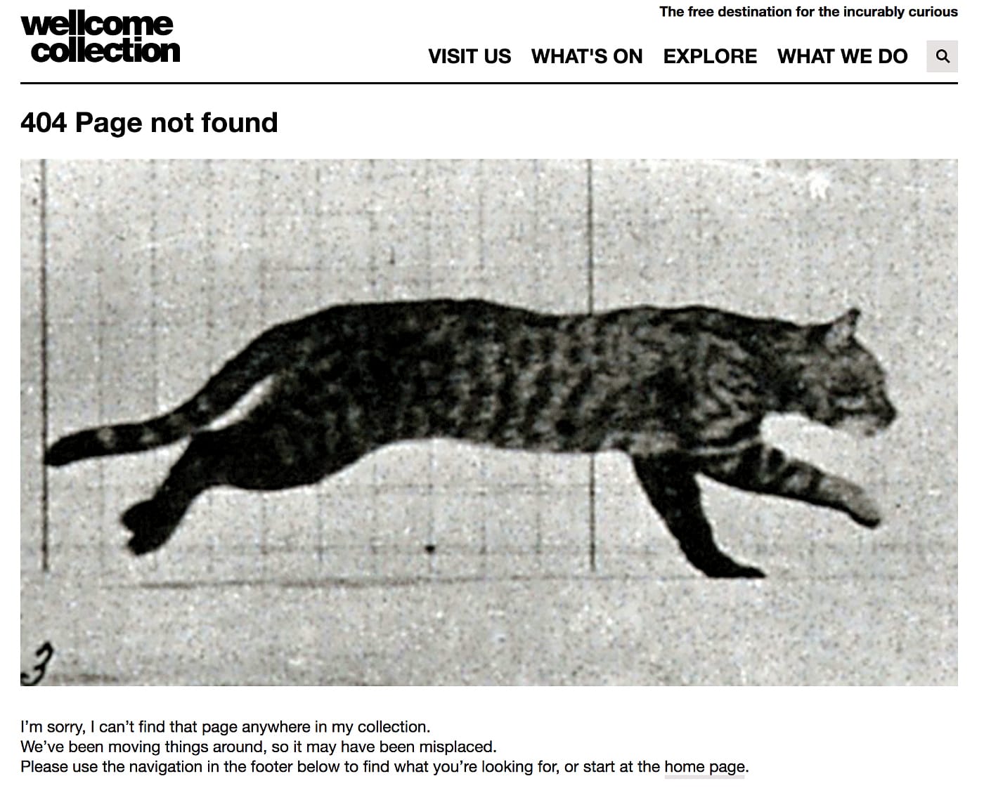 Solomon R. Guggenheim Museum, New York, with a 404 page that rotates dire images from the institution’s collections and exhibitions, including this one of Maurizio Cattelan’s “Daddy, Daddy” (2008)Smithsonian National Air and Space Museum, Washington, DC: “Houston, we’ve had a problem”Jewish Museum, New York: “Oy Vey!”Vasa Museum, StockholmMuseum of Modern Art, New York, with Ed Ruscha’s “OOF” (1962)Cooper Hewitt, Smithsonian Design Museum, New York, with a 404 page including a link to the Chester Jenkins typographyThe 404 page on the Cooper Hewitt collection siteVictoria & Albert Museum, London, with “Mirror” (1675)Museo del Prado, MadridSeattle Art Museum, with a video of a baby seal at the Olympic Sculpture ParkThe Andy Warhol Museum, Pittsburgh, with a 404 page that pulls up the livestream of Warhol’s graveWalker Art Center, Minneapolis, with work by Jasper Johns and Robert Therrien spelling out “404”Natural History Museum, London, with the institution’s “newest extinct resident”: a stegosaurus skeletonMuseum of Science and Industry, Chicago: “Whoops. There it isn’t,” with the 1902 Lambert typewriter that attempted to improve typingMount Vernon, Virginia, with George Washington’s faux “Rules of Civility”National Museum of Funeral History, Houston: “You have made a grave mistake!”Crystal Bridges Museum of American Art, Bentonville, Arkansas, with Joseph Decker’s “Boy Smoking” (1853–1924)Denver Museum of Nature and Science: “It’s not the end of the world…”Museo Nacional Centro de Arte Reina Sofía, Madrid, with one of the cycling 404 pages, this one showing the animation of Daniel G. Andújar’s “Technologies to the People” (2015)Exploratorium, San Francisco, with a link to instructions for building a camera obscuraCalifornia Science Center, Los Angeles: “Your theory about the location of this page has not withstood experimental analysis”Wellcome Collection, London, with an animation of Eadweard Muybridge’s running catThe Tech Museum of Innovation, San Jose, CaliforniaPerot Museum of Nature and Science, Dallas: “This experiment has gone wrong”Science World at Telus World of Science, VancouverRock and Roll Hall of Fame, Cleveland, with a 404 page whose “page not found” and “broken” texts are animated as breakingHenry Ford Museum of American Innovation, Dearborn, MichiganSalvador Dalí Museum, St. Petersburg, FloridaShchusev Museum of Architecture, Moscow