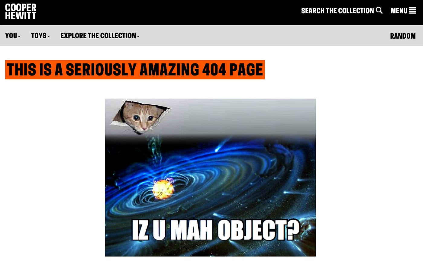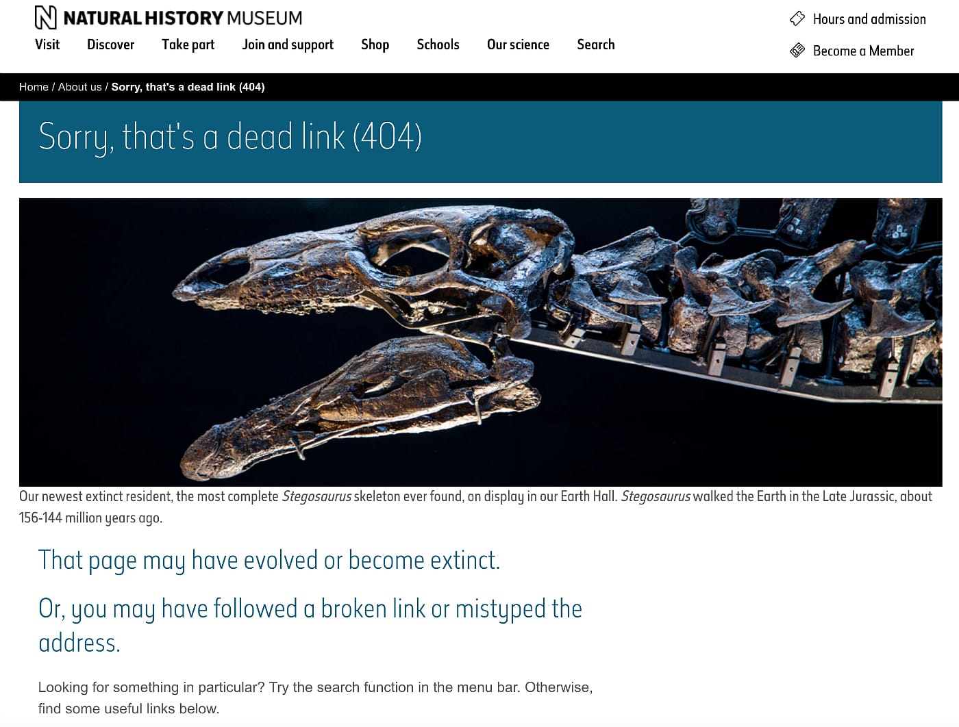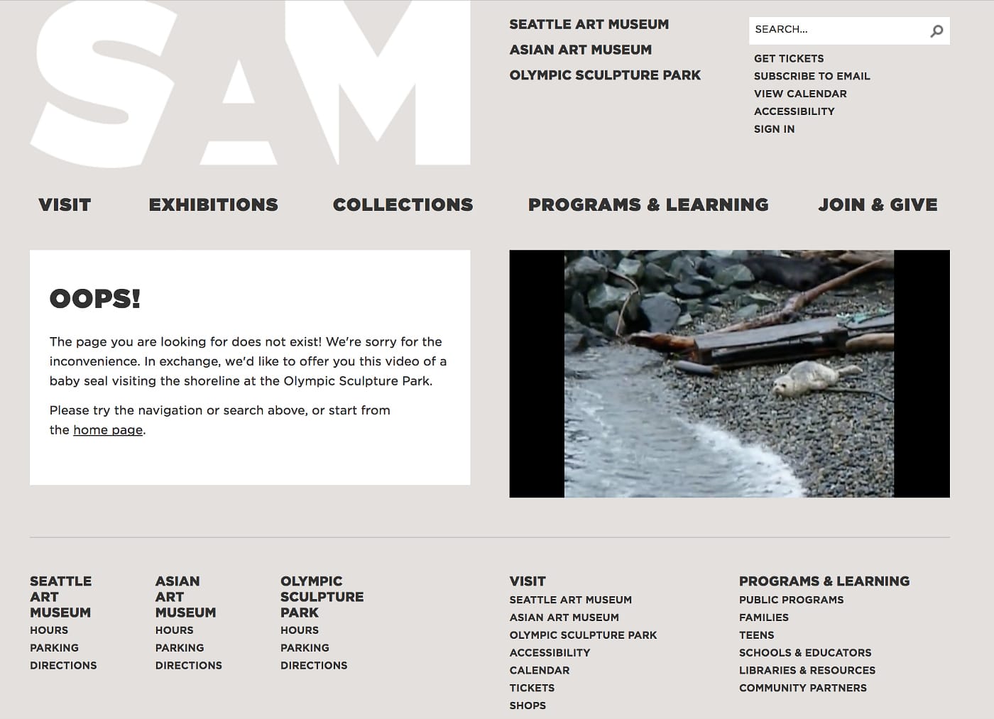 Broken links are strewn throughout the internet, digital dead ends created by lost archives, website revamps, or just sloppy typing. Some museums simply have standard “page not found!” text on their 404 error pages or built-in redirects to their home pages. But other institutions are more playful with bad URLs, using art from their collections or that they’ve exhibited to visualize the mistake: for example, the New Museum’s 404 page features a Maurizio Cattelan horse whose head is lost in a wall. (Cattelan is a bit of a 404 favorite, with his dead Pinocchio in the atrium of the Guggenheim Museum appearing on that institution’s page.) A few museums offer a small easter egg, including San Francisco’s Exploratorium, which links to instructions for building a camera obscura, and the Seattle Art Museum, which has an embedded video of a baby seal filmed at its Olympic Sculpture Park. Still others take the opportunity to provide some on-brand humor, like London’s Natural History Museum, whose 404 page shows a stegosaurus skeleton above the text, “That page may have evolved or become extinct,” and Houston’s National Museum of Funeral History, which states, “You have made a grave mistake!” over an image of a coffin.