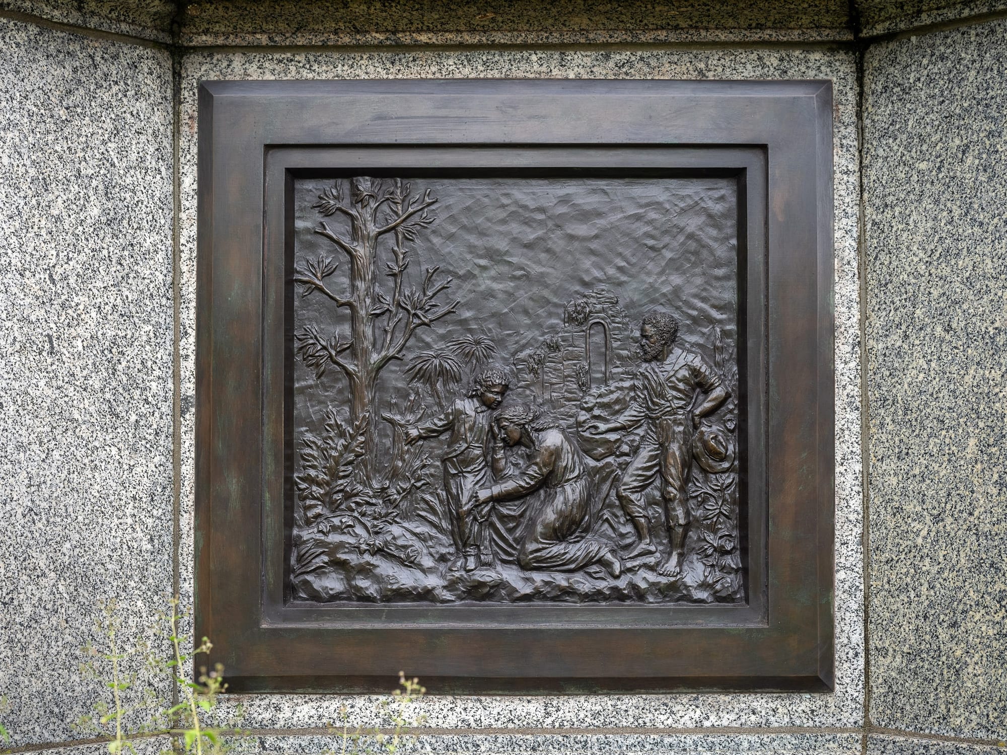 While there are hundreds of plaques, markers, abstract sculptures, and living memorials honoring Black Americans throughout the city, Felsen’s guide specifically focuses on public visual representations of Black people. Organized chronologically, it begins with the first appearance of a Black American in a New York City monument: a nameless, formerly enslaved Black man featured in a bronze bas-relief panel in the Civil War Soldiers’ Monument (1869) at the Green-Wood Cemetery.
