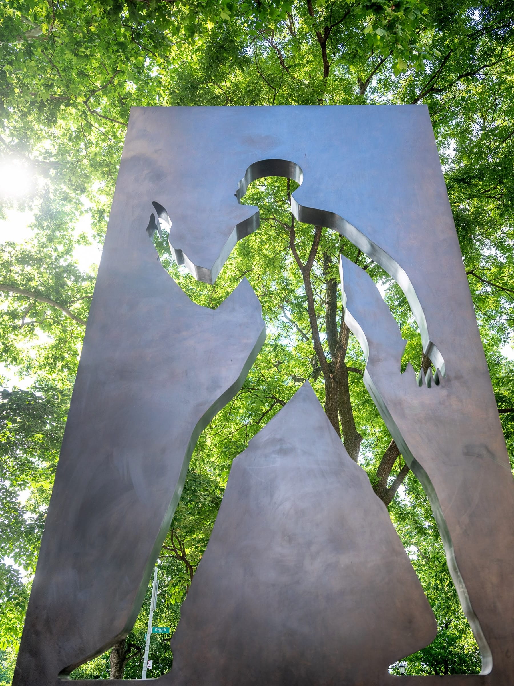 In Upper Manhattan, amid the vibrant green foliage of Riverside Park, the whiz of rushing cars from the West Side highway, and the hum of bustling Harlem apartments, a 15-foot-tall bronze depicts the hollow outline of a man frozen mid-stride with one cautious hand raised. A quote from Ralph Ellison’s pioneering 1952 novel is etched into the surface of a low-lying granite panel: “I am an invisible man… I am invisible, understand, simply because people refuse to see me.”