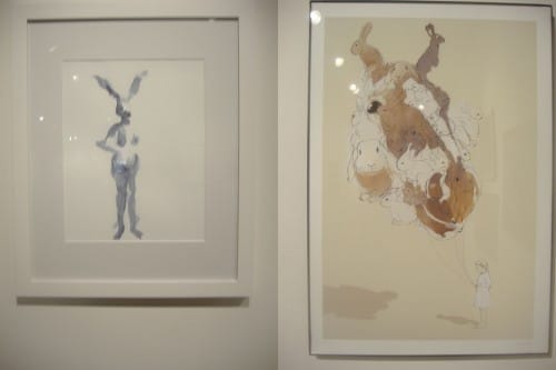 Susan L. Siegel‘s drawing and Imogen A. Slater‘s print use rabbits in order to create a dream-like atmosphere in their works, recalling Lynch’s short film Rabbits (sections of this film were also added to Lynch’s 2006 film Inland Empire), in which a family of anthropomorphic rabbits spew non-sequiturs on a sitcom sound stage.