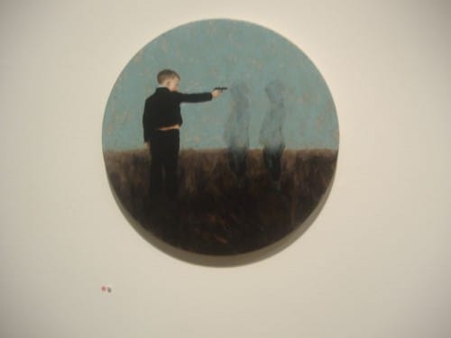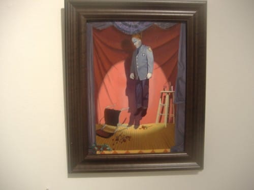 Perhaps the most chilling work from the show is Alexandro Berrios’s “Suicide” (2010). Hanging from a noose, a uniformed man with clown makeup appears to what appears to be a stage with roses thrown from the audience. Frankly, I was surprised David Lynch hadn’t thought of it first.