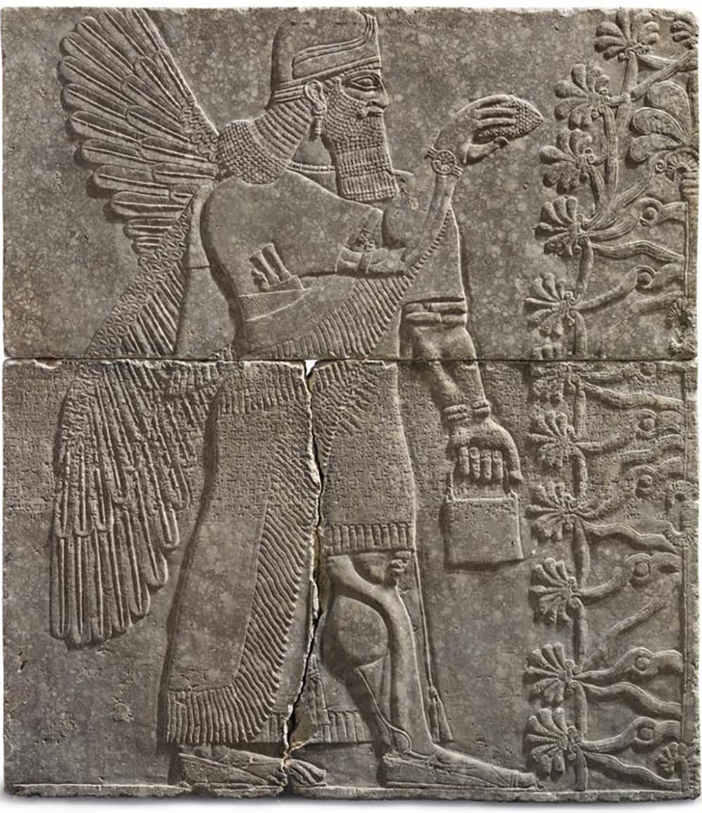 The Ashurnasirpal relief depicts a Winged Genius, a deity also known as an Apkallu, holding a bucket and a cone-shaped object, signifying fertility and protection for the king. The Apkallu has feathered wings and wears elaborately detailed robes, a horned headdress, an earring, a necklace, and armlets, and has two daggers and a whetstone tucked into fabric folds at his waist.