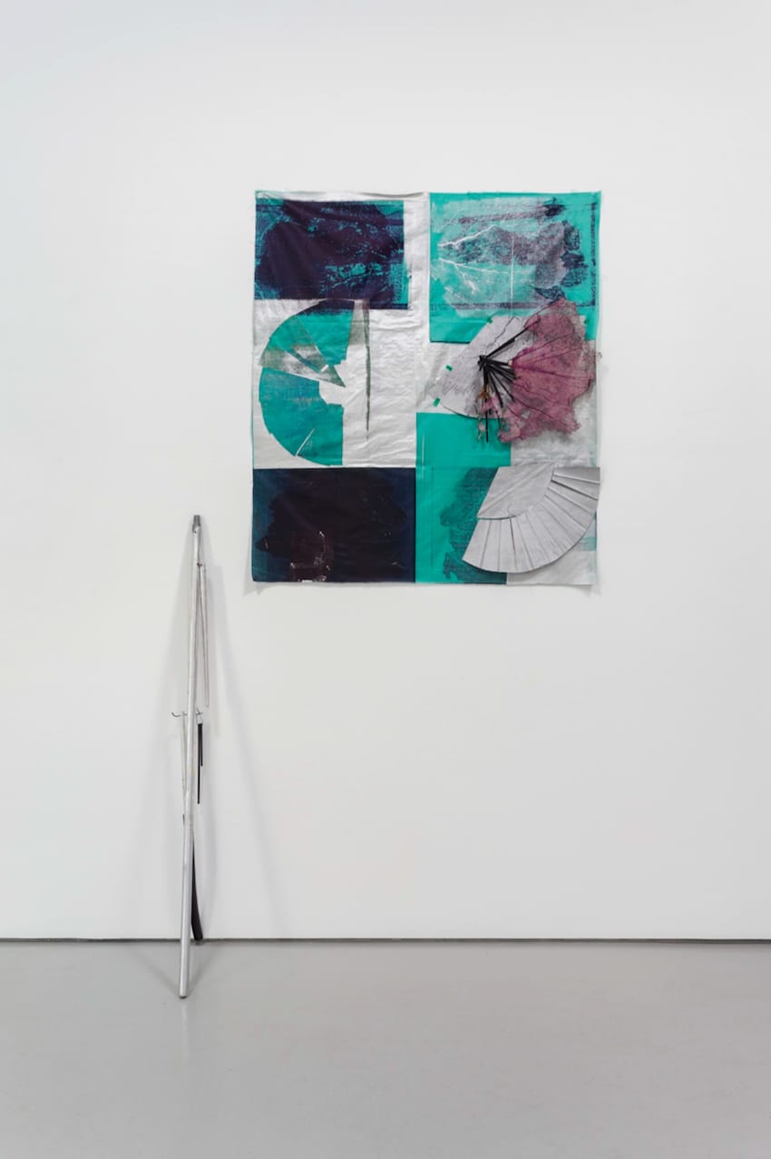 Organic elements (coral in particular) symbolize man’s impact on nature and cultivate a sense of detritus washed ashore. “[a ~ploy~] Broomstick’s Periostracic Transitional Device_lead_Verdant Ventalina’d Ventilator” is a panel of nylon spinnaker sail pinned to the wall and divided into uneven color blocks of black, silver, and sea foam green, with a fan made of pink gorgonia ventalina coral and chopsticks attached and a silver broomstick leaning against the wall. For “Witches Ploying the Fans,” a smaller work near the gallery’s entrance, two pieces of spinnaker sail are divided into three rectangular block prints, with window screening and silver coral — manmade and organic patterning — overlapping in the central print. In both pieces, Levant quietly evokes the floods and tsunamis that have devastated the Pacific Rim in recent years.