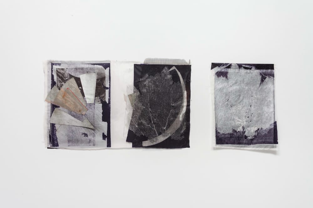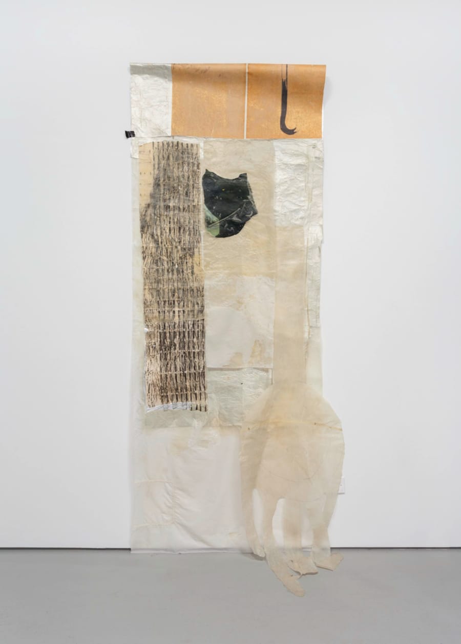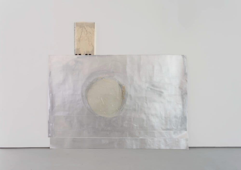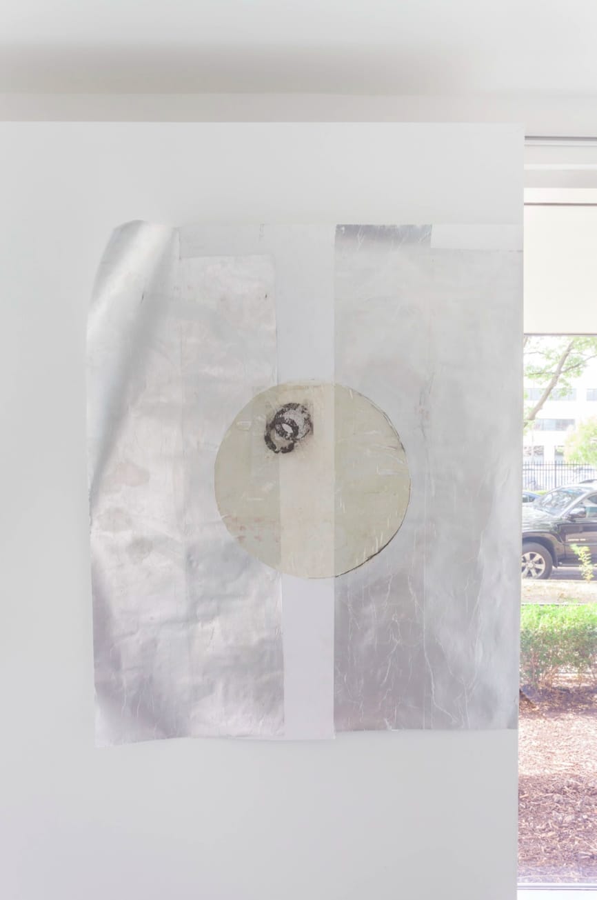In this way, the artwork invokes a tradition of women artists, notably Eva Hesse, whose art uses formalist principles to play against the formalism of male counterparts. It’s particularly evident in two pendant pieces, “Nacre’ous Composite Vivisection” and “Nacre’ous 00cellum.” Both large, rectangular planes of aluminum foil with circles cut out near the center, the pieces literalize what Michael Fried famously called the “theatricality” of Minimalism by actually reflecting light back onto the viewer (also reiterating the theme of water). Yet where Minimalist icons by the likes of Richard Serra or Tony Smith stare down the viewer with their size, weight, and precision, “Nacre’ous Composite Vivisection” is anti-monumental, hung low to the ground (the bottom edge flush with the floor); the circle is off-center and a smaller sheet of paper sits on the top edge like a chimney. And the aluminum foil sheet that constitutes “Nacre’ous 00cellum” curls up from the wall on one edge and butts up to a window on the other edge.