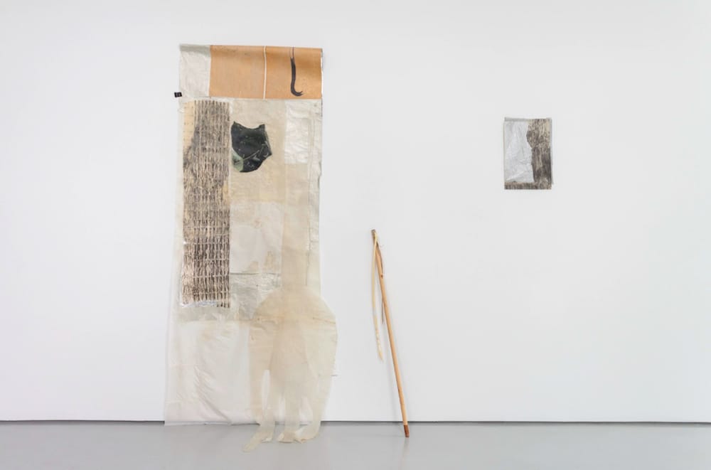 …Which’s Ploying the Fans (all works 2016) is comprised of diaphanous collages, primarily in neutral tones (a vibrant sea foam green piece stands out), all unframed, along with a handful of sculptures, including two embellished broomsticks resting against the wall.