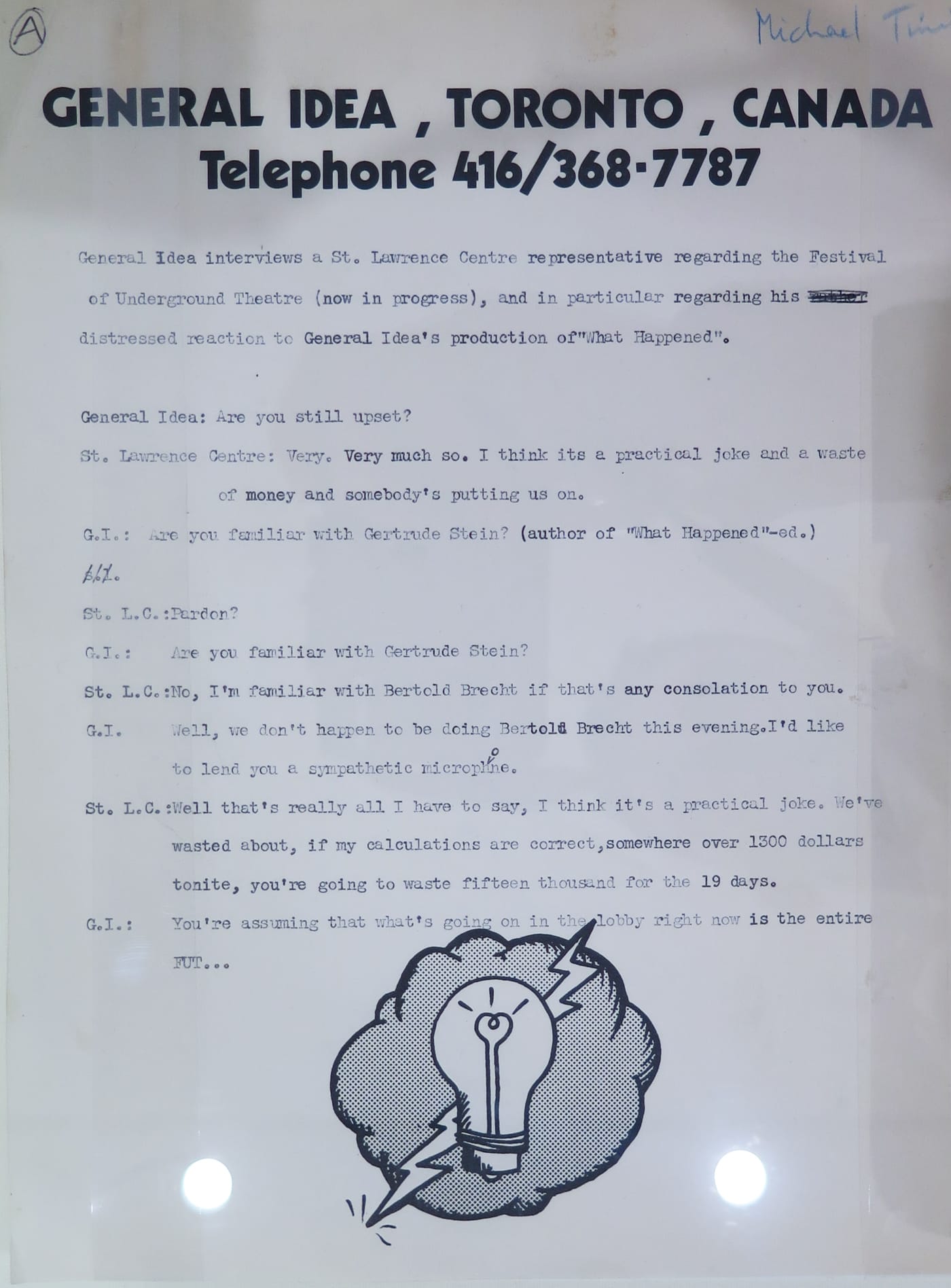 Unsurprisingly, some of General Idea’s more absurd and improvisational musings on the nature of performance and art practice were met with eviscerating criticisms or outright incomprehension. “I think it’s a practical joke and a waste of money, and somebody is putting us on,” a representative of the St. Lawrence Centre for the Arts told General Idea in a phone conversation that the artists documented during a presentation of their 1970 performance “What Happened” at the Festival of Underground Theater in Toronto. The multi-part performance, which was based on Gertrude Stein’s play of the same name, was spread across the three week festival and included the “Miss General Idea Pageant.”