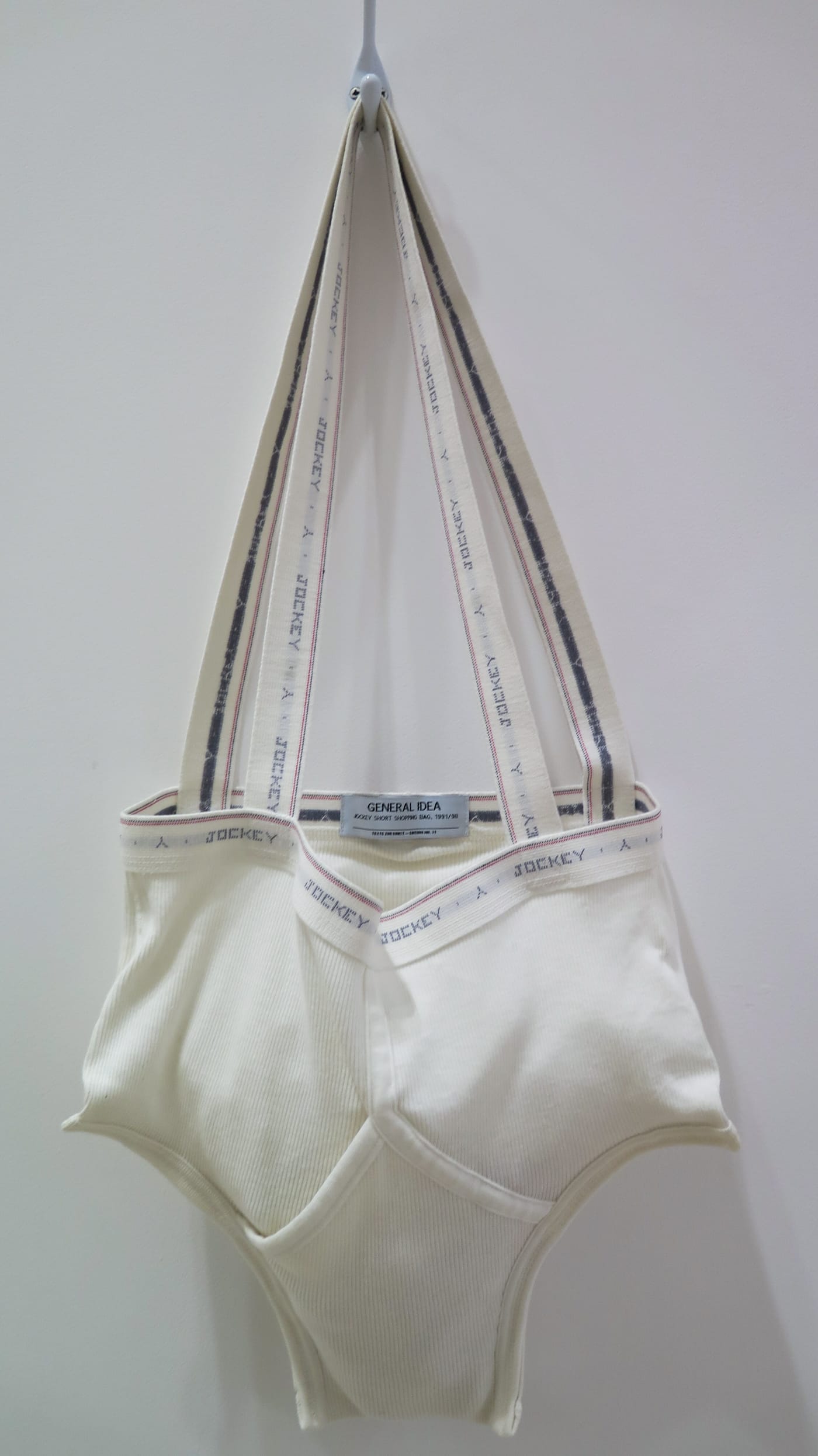 This retrospective, titled Broken Time, is framed by a repeating bas relief motif of giant pills — a visualization of the countless drugs those infected with HIV ingested in hopes of lessening the deadly effects of the illness — and the collective’s most iconic image, a repeated pattern of the “AIDS” acronym modeled after Robert Indiana’s famous “LOVE” prints and sculptures. The evolution that the work takes, chronologically laid out across two floors of the museum, is drastic, beginning with text, video, and performance work derivative of the Fluxus and Dada groups, and ending with tweaked commercial objects pleading the urgency of the AIDS crisis, including a General Idea brand “Jockey Short Shopping Bag” and a series of caricature self-portraits by the three artists.