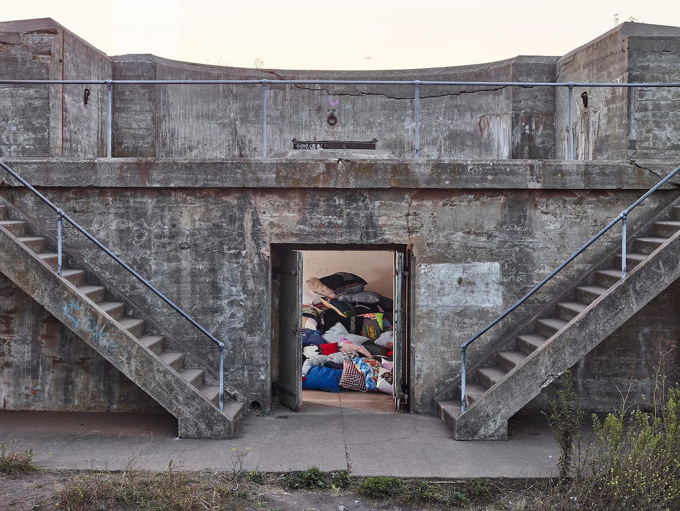 In 2016, “34,000 Pillows” was installed as part of Home Land Security, an exhibition organized by the For Site Foundation in the former military structures in San Francisco’s Presidio. The location was eerily appropriate. Framed in cement behind thick double doors, one got the sense that the pillows — seemingly personal items in their color and patchwork — were abandoned by their owners in less than ideal circumstances.