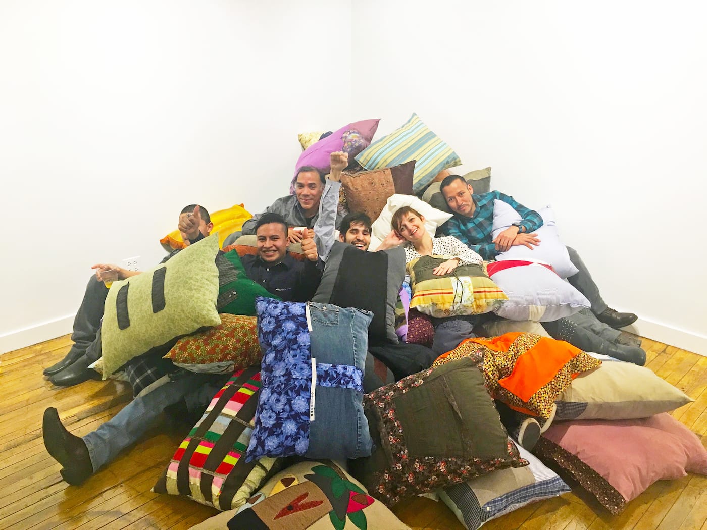 In order to reflect the community in which they worked, the materials for the pillow covers were largely sourced from undocumented immigrants themselves in the form of donated clothes. “Each piece of clothing carries the story of the person that wore it,” said Díaz-Perera. “one of the people, for example, crossed 14 counties on his journey to the United States, and he donated the pants he wore on his journey.”