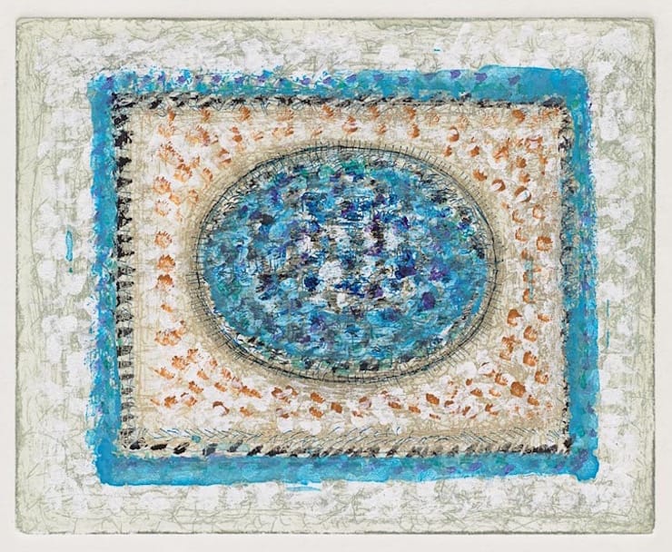 In four etchings, all measuring 8 by 10 inches, Pousette-Dart incised an oval inside a welter of abstract marks. He then made further additions to three of them. In “Blue Sonata” (1980), he filled the oval with blue acrylic paint strokes, which he also used for a blue border around it, evoking carpets and the decorative tradition. In this and other works in which color is added, one senses the artist’s joyousness. It is a bliss that has to do with making, rather than selling. Remember, he didn’t edition his work. Such acts seemed superfluous to him. This is another reason why he should be important to many young artists.