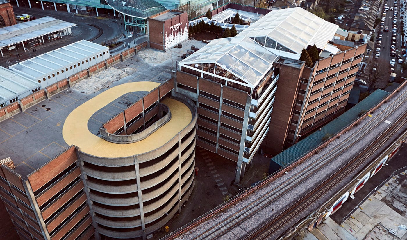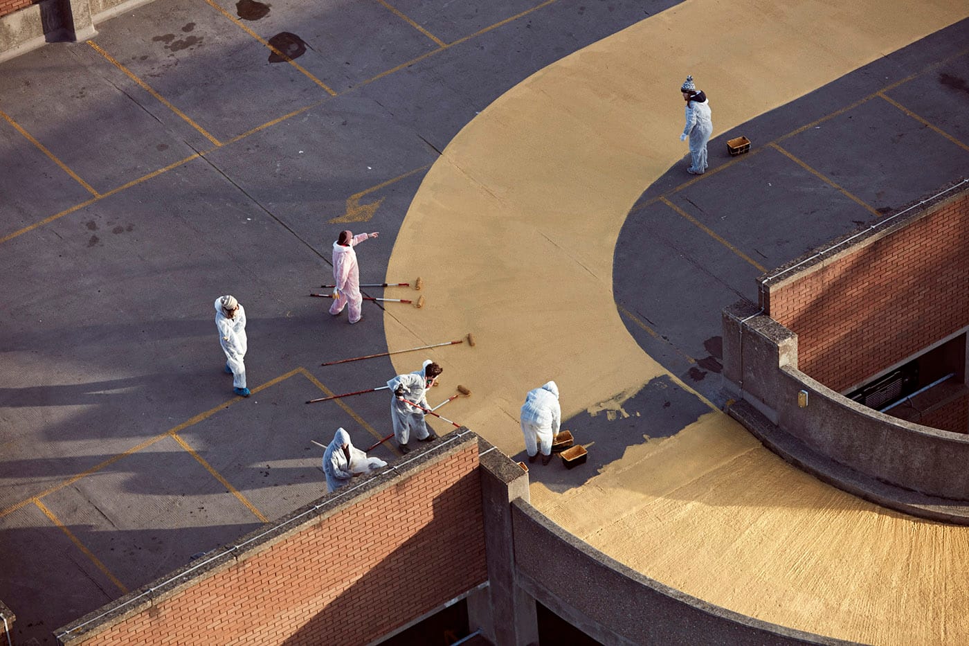 “When Liz first showed me the parking lot that David had described to me,” Baldauf told Hyperallergic, “the zero form that we ultimately painted gold actually lit up in my mind within the first 30 seconds.” The project used gold paint to highlight the topmost roundabout level of the decommissioned lot at the Television Centre building.