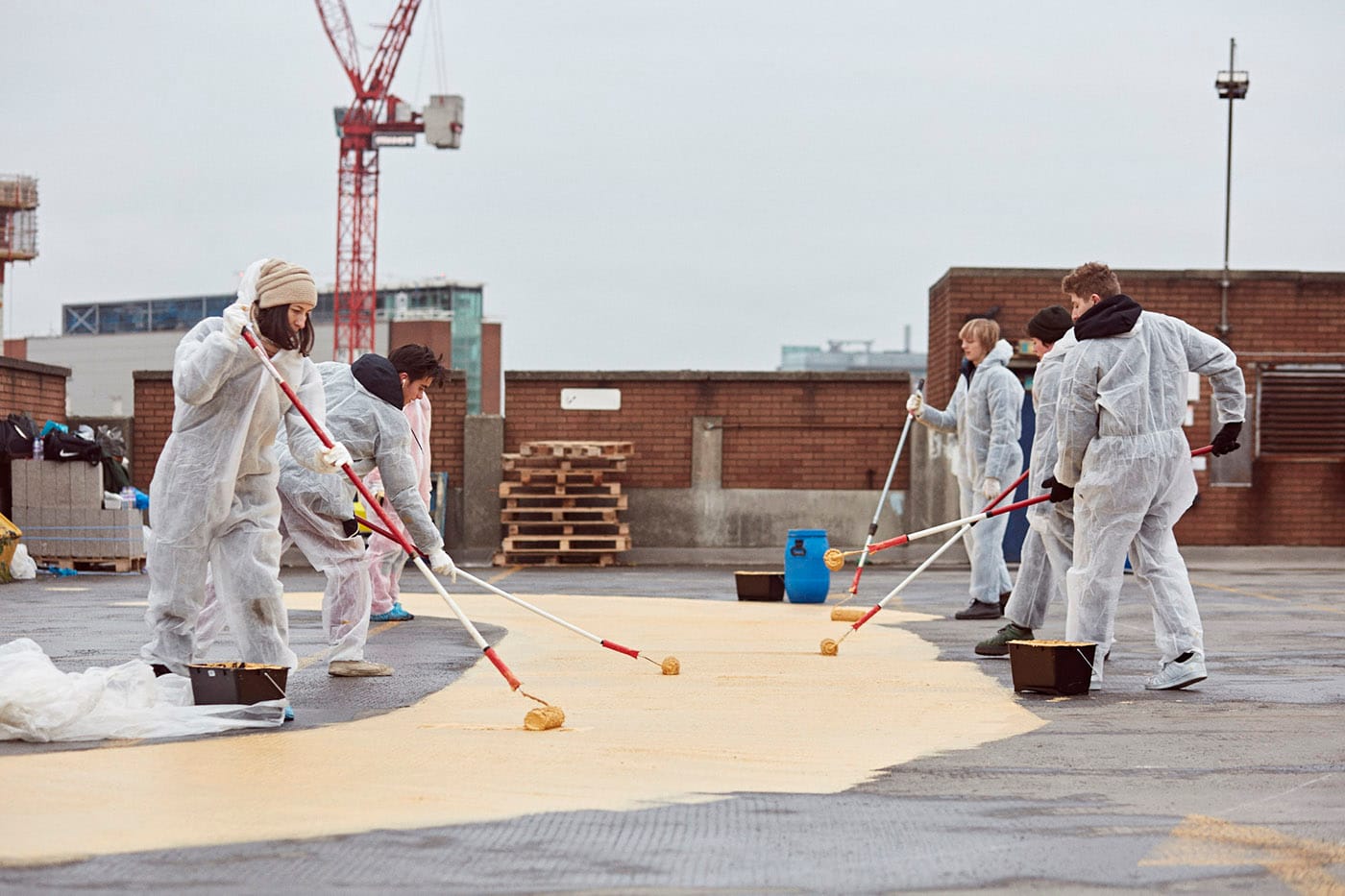 “The roof we painted on is a long-time BBC parking garage,” she explains. “I wanted to work with White Noise City, Gallery Griffin, Liquitex, and local people to point out that we are able to frame things that are not in a museum. The history of our walks to and from work, and the conversations that we have next to our cars or on the London Underground, are wildly rich. As citizens, it is our job to be docents of our neighborhoods and exclaim how great it is to live where we live, to have the chance to visit the places we visit, and to frame the moments and locations that we hope become destinations.”