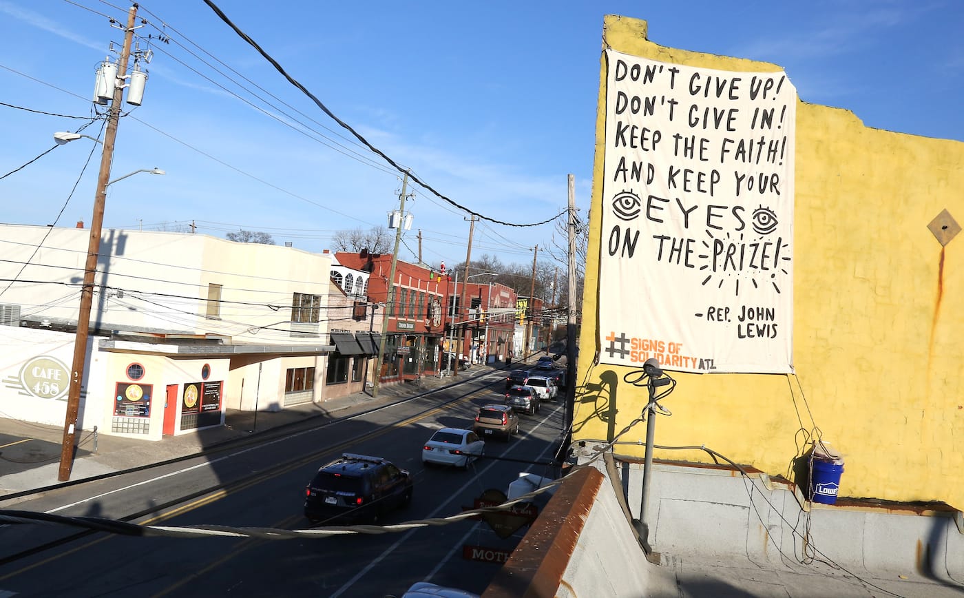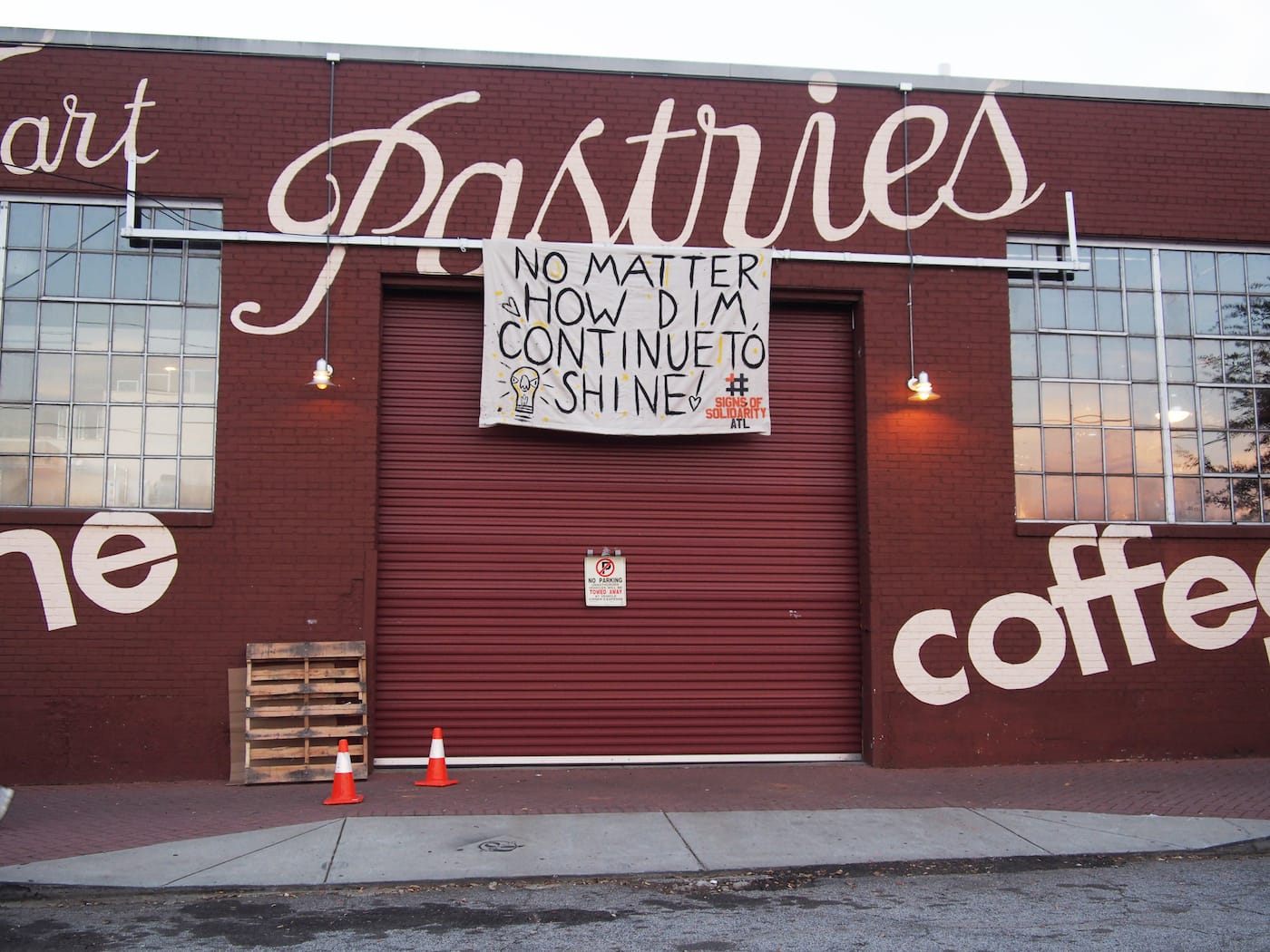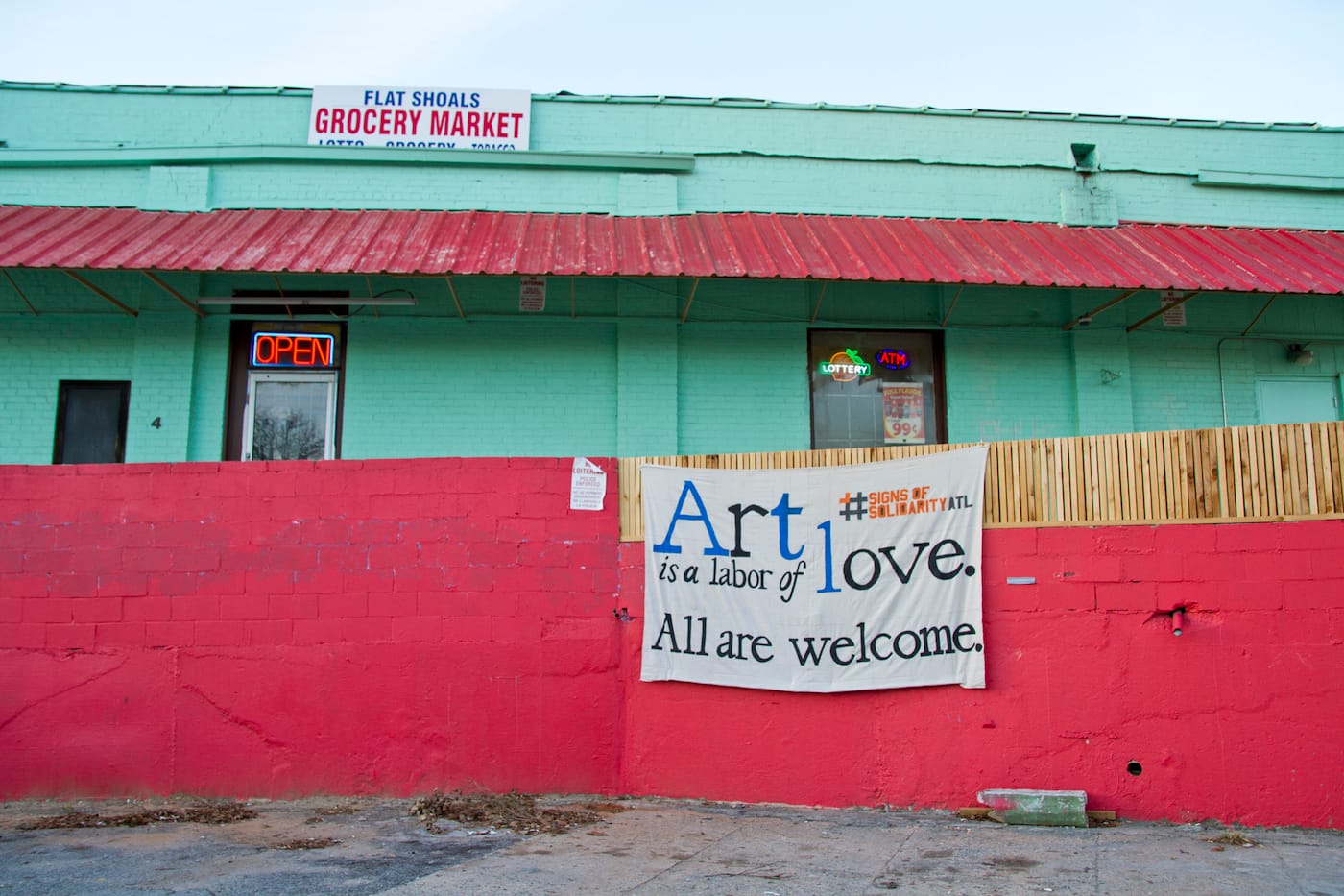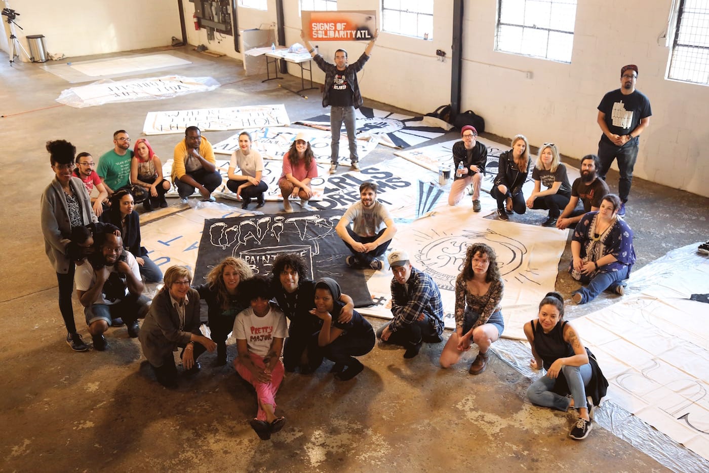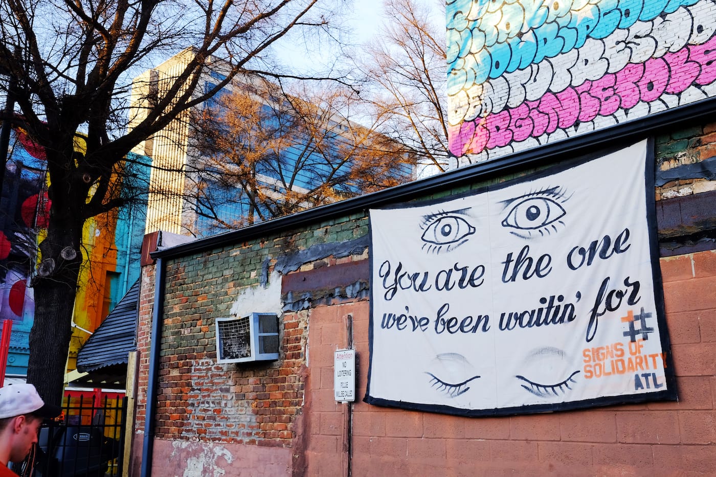 #SignsofSolidarity began in Philadelphia, initially conceived as a banner drop confined to private homes. It quickly grew, though, into a city-wide endeavor and crossed the 800 miles into Atlanta after Monica Campana of local nonprofit Living Walls heard about it. After contacting Benner and his collaborators to express her interest in replicating their efforts in the cradle of the civil rights movement, she began reaching out to people in the Atlanta arts community, and many responded swiftly.