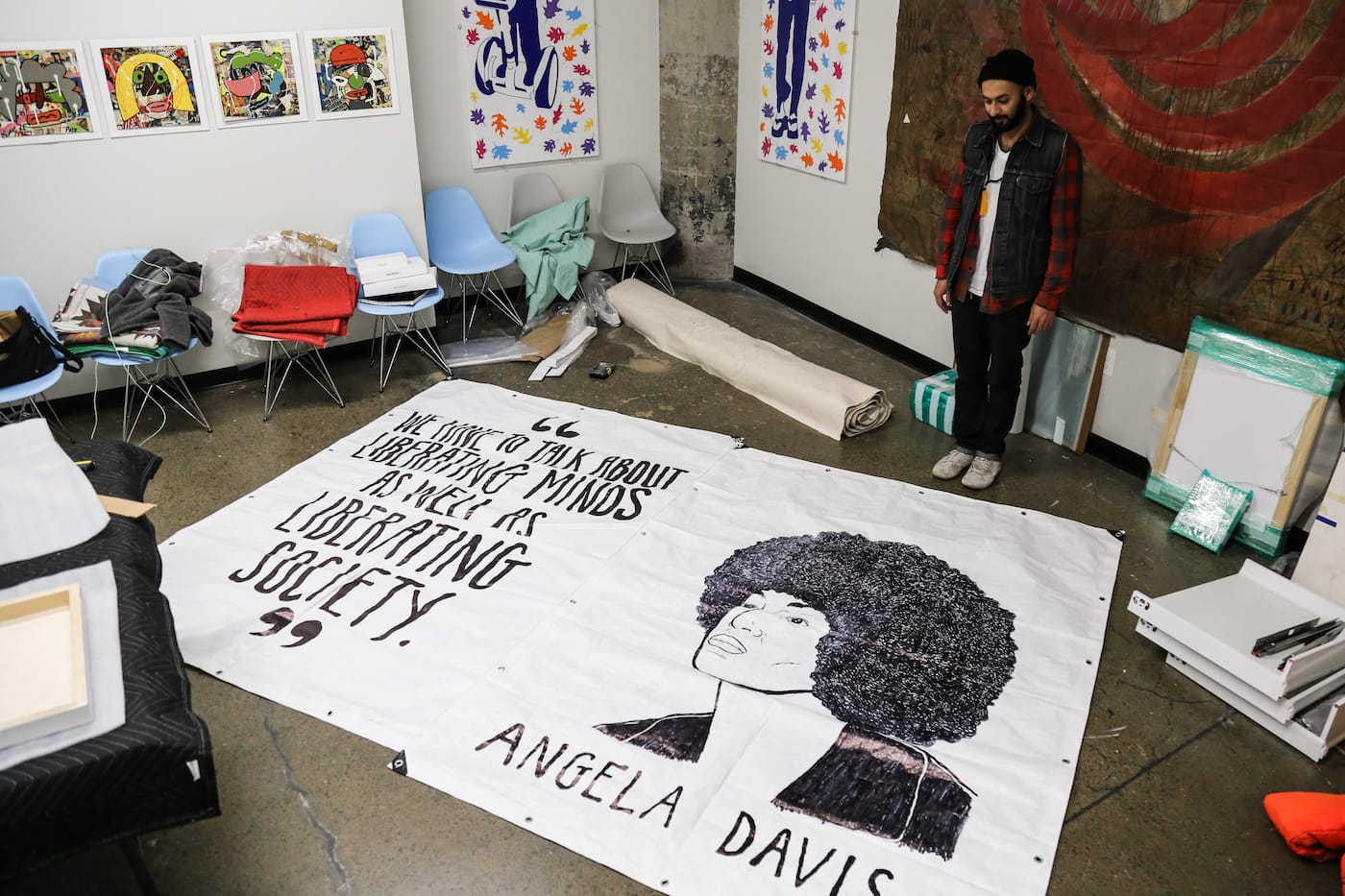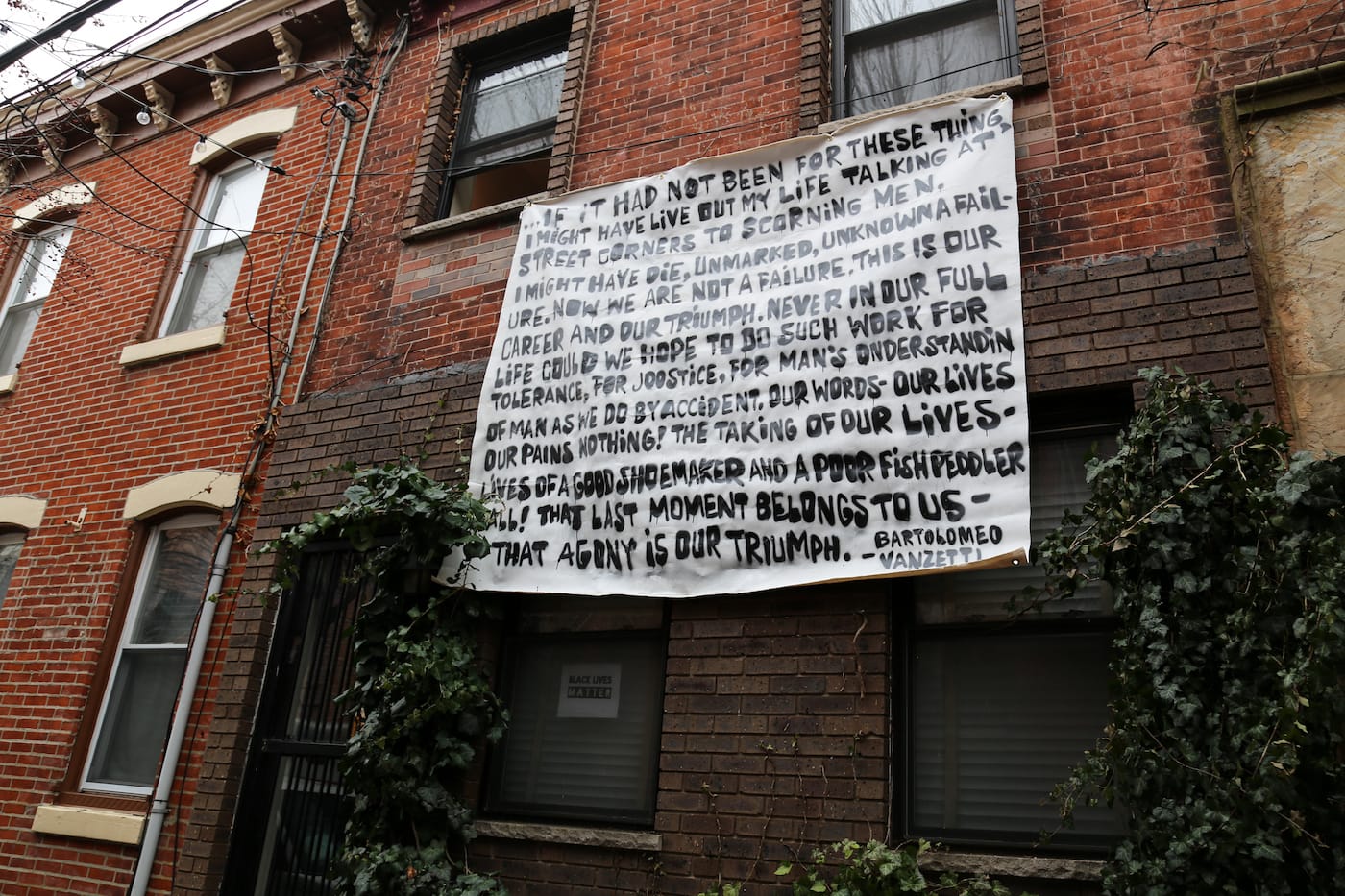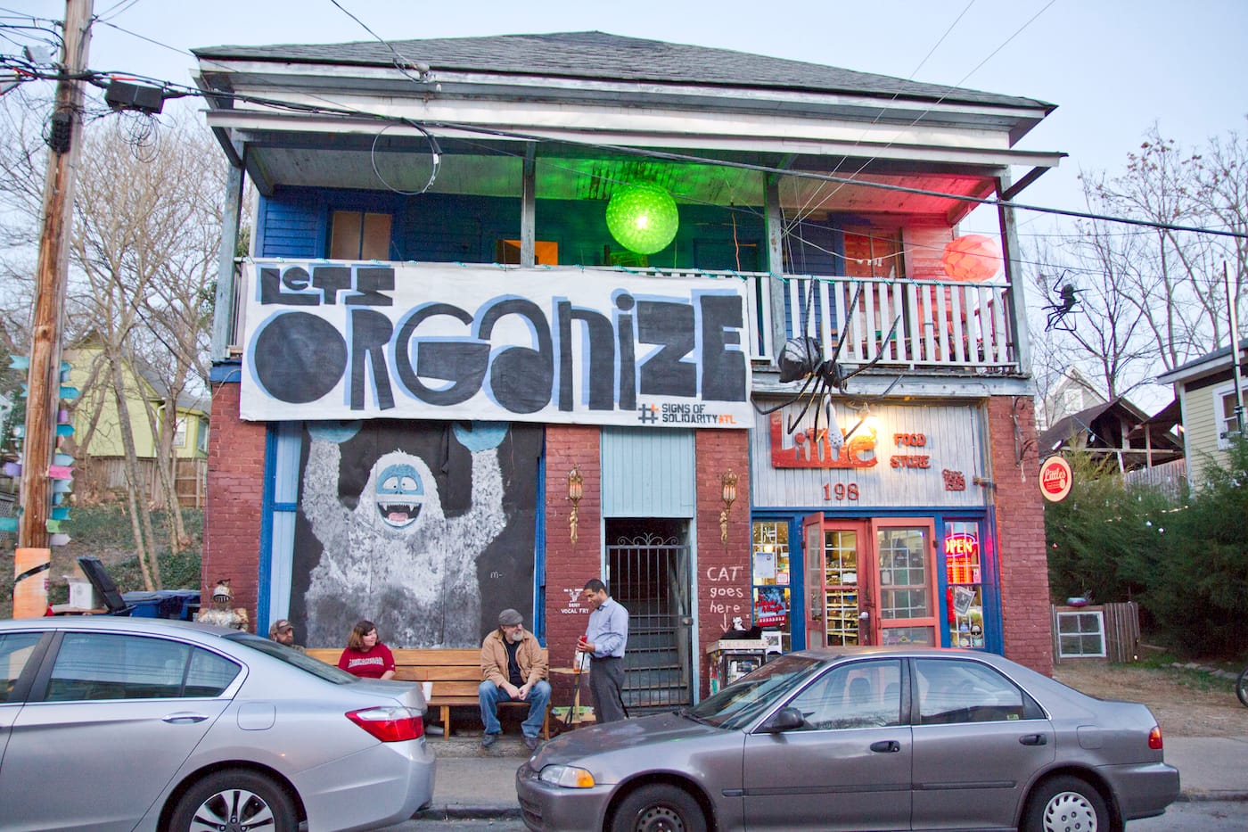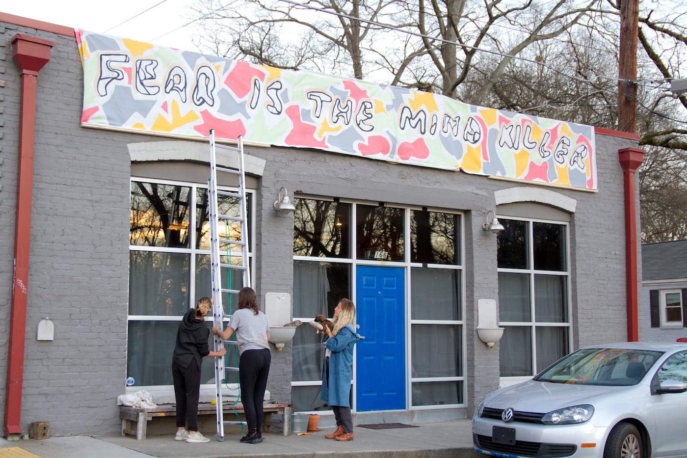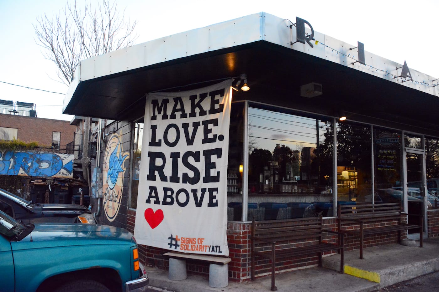 #SignsofSolidarity began in Philadelphia, initially conceived as a banner drop confined to private homes. It quickly grew, though, into a city-wide endeavor and crossed the 800 miles into Atlanta after Monica Campana of local nonprofit Living Walls heard about it. After contacting Benner and his collaborators to express her interest in replicating their efforts in the cradle of the civil rights movement, she began reaching out to people in the Atlanta arts community, and many responded swiftly.