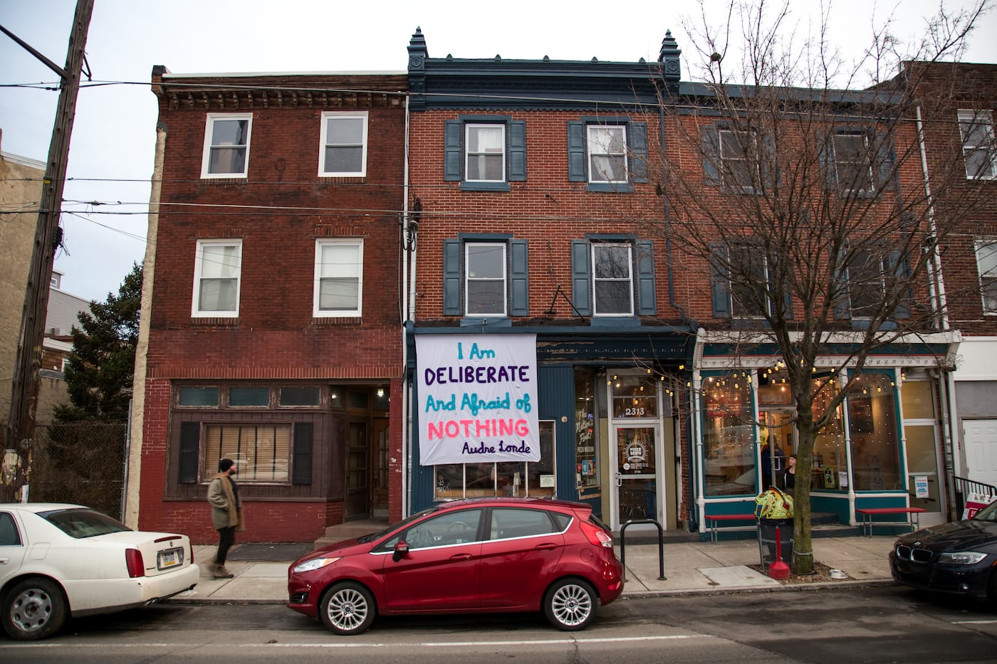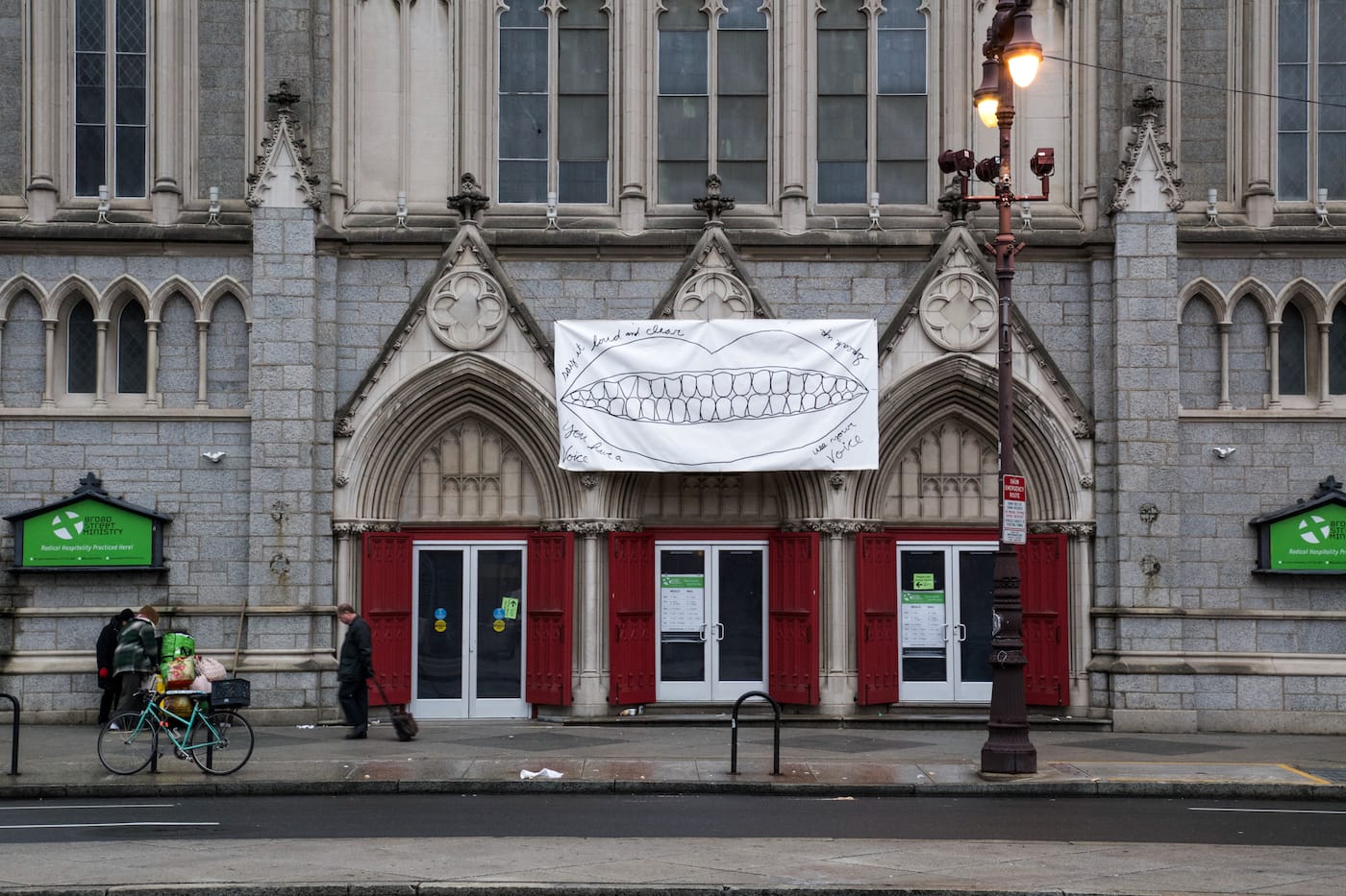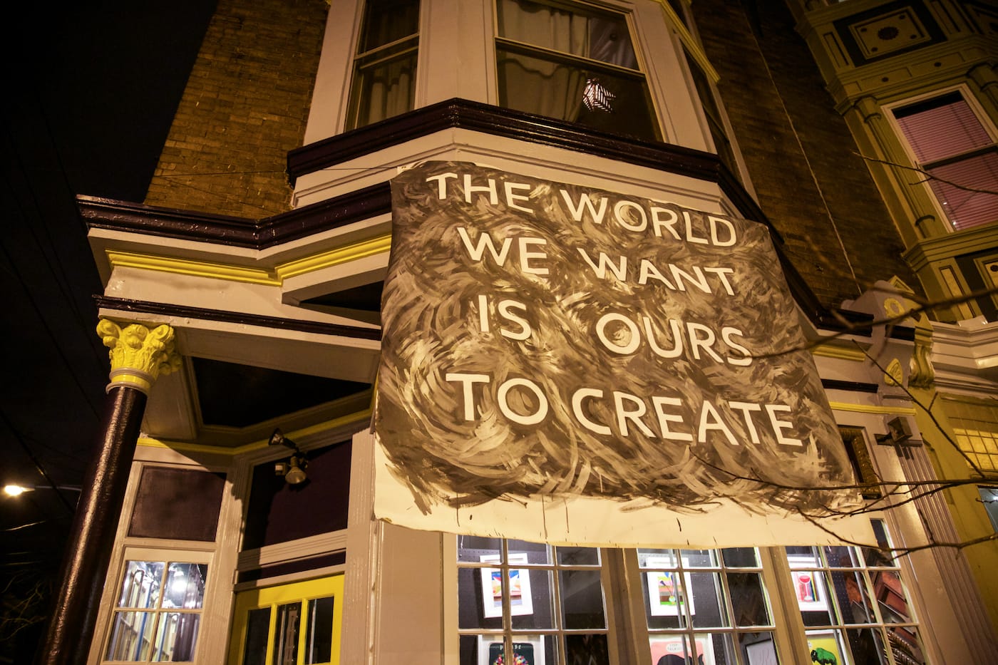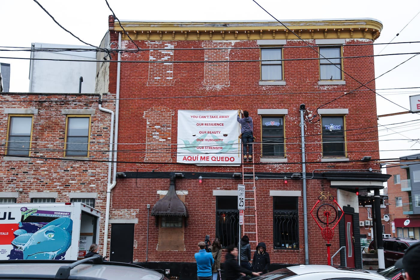 Artist Michelle Angela Ortiz‘s banner, which hangs at Johnny Brenda’s Tavern in Philadelphia, is one that specifically addresses communities at risk with the entry of Trump’s administration. Featuring two hummingbirds in flight, it reads, “You can’t take away our resilience, our beauty, our humanity, our strength. ‘Aqui Me Quedo/‘ [Here I will stay].”