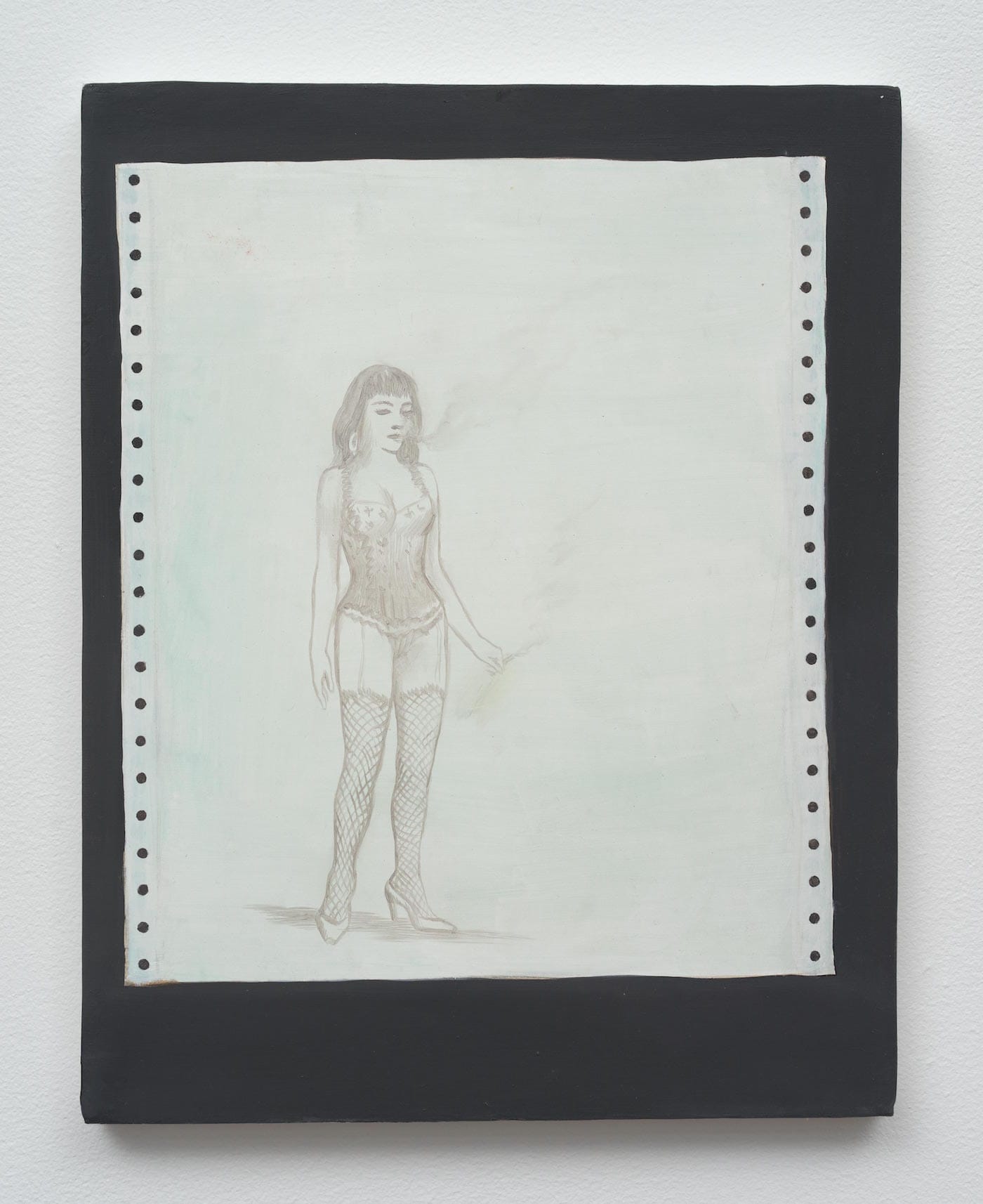 In “Smoking” (2014), the first work in the show, a woman dressed in fishnet stockings, high heels, and a bustier, smokes and talks on the phone. The painting, which looks like a drawing on dot-matrix printer paper mounted on a black background, has a smooth, high-gloss surface, an effect Twilley achieved by sanding the canvas.