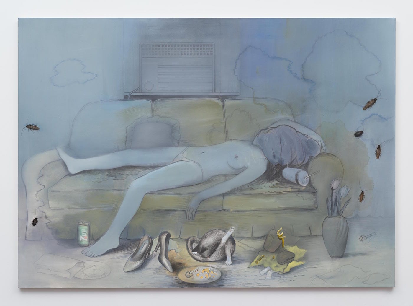 Many of Twilley’s paintings also display a “double-consciousness” that derives, in part, from the difficult, yet fruitful tension between her formal training as a painter and her working class childhood. “Napping by the AC” (2016) expresses this tension. Like the woman in “Summer Night,” the subject’s face is covered, but she’s wearing underwear, exposing only her breasts. The blanket or shirt over her face appears to be suffocating her, as if her whole identity is being stripping away. The crumpled McDonald’s wrappers, the cat cleaning its ass, and the humorously oversized roaches crawling up the canvas suggest an overall lack of cleanliness.