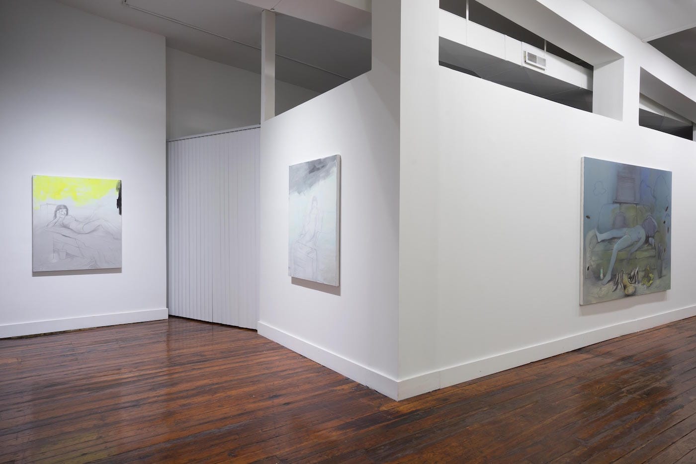 The paintings in Brandi Twilley’s current exhibition, Imaginary Friend, at Lord Ludd depict young women, many partially or fully naked, their faces sometimes obscured by clothing or hair. Growing up in Oklahoma, Twilley’s aesthetic developed alongside the standards of beauty and gender roles established in mainstream movies like Pretty Woman, which confront young women with Hollywood fictions to which they can never measure up.